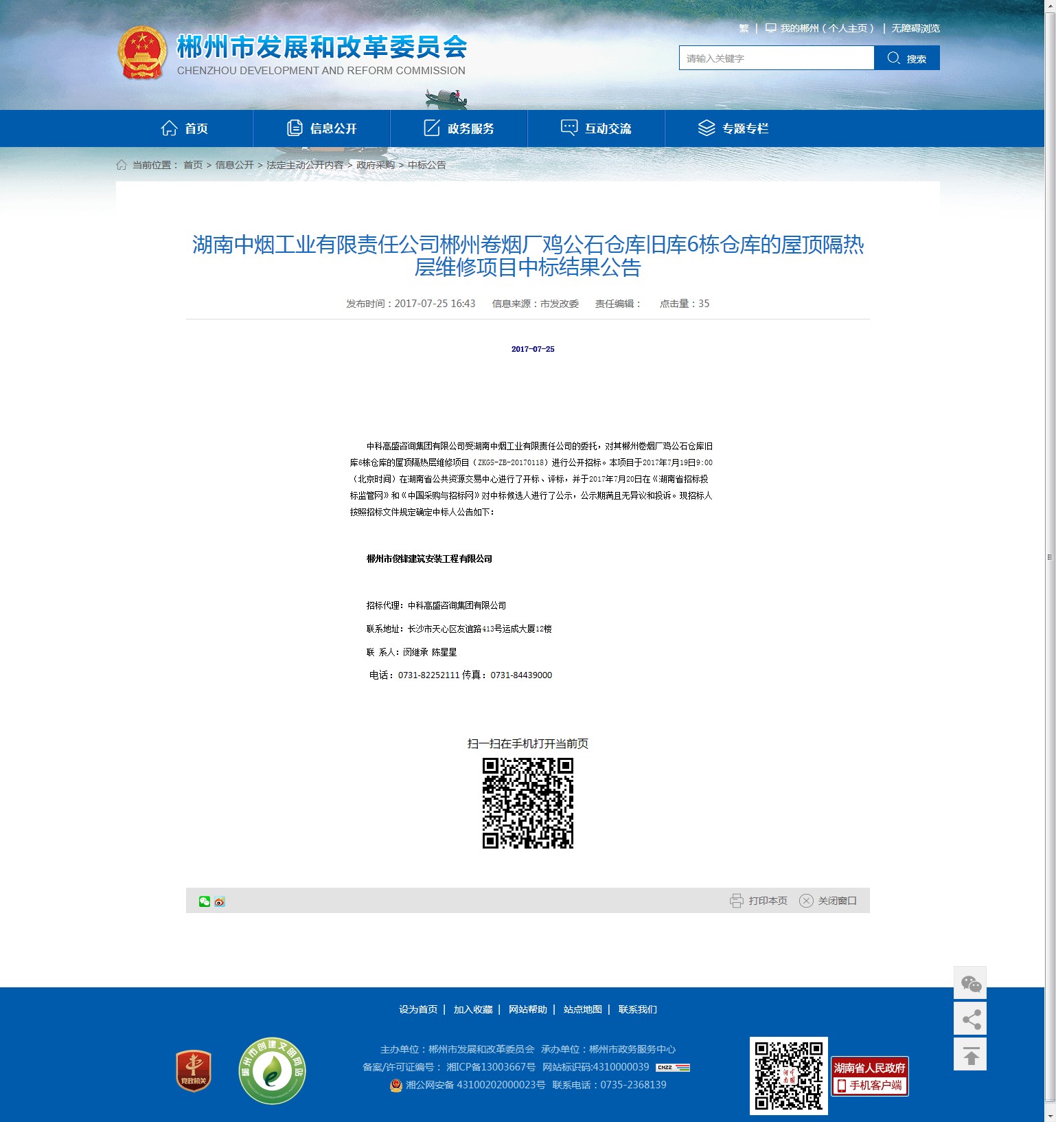 中科高盛咨询集团有限公司受湖南中烟工业有限责任公司的委托,对其郴州卷烟厂鸡公石仓库旧库6栋仓库的屋顶隔热层维修项目(ZKGS-ZB-20170118)进行公开招标。本项目于2017年7月19日9:00(北京时间)在湖南省公共资源交易中心进行了开标、评标,并于2017年7月20日在《湖南省招标投标监管网》和《中国采购与招标网》对中标候选人进行了公示,公示期满且无异议和投诉。现招标人按照招标文件规定确定中标人公告如下:
