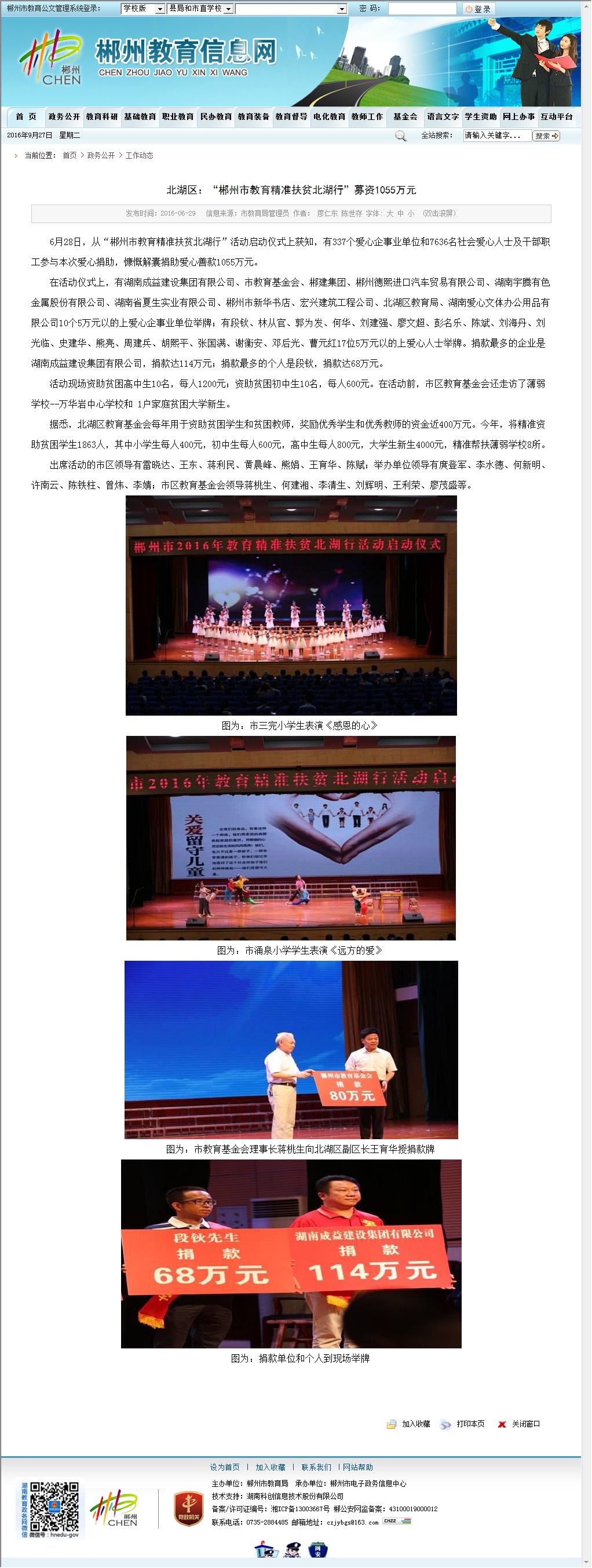 6月28日,从“郴州市教育精准扶贫北湖行”活动启动仪式上获知,有337个爱心企事业单位和7636名社会爱心人士及干部职工参与本次爱心捐助,慷慨解囊捐助爱心善款1055万元。