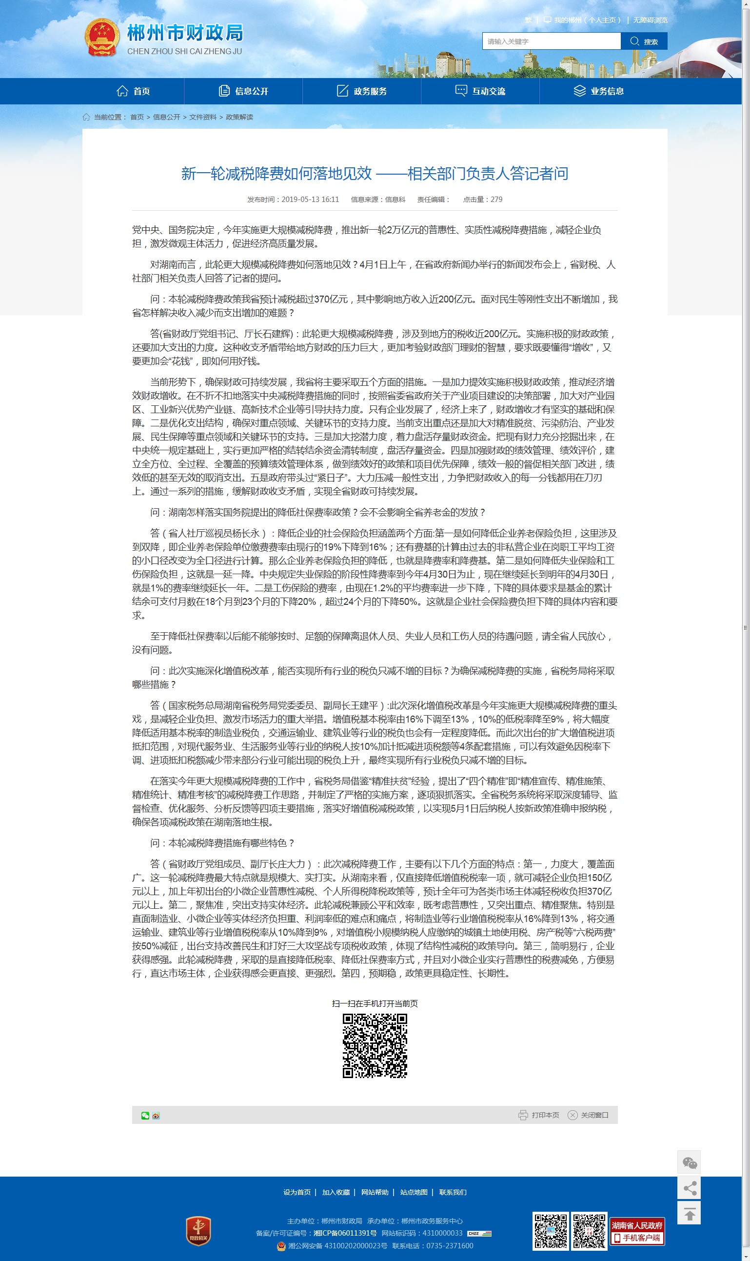 答(省财政厅党组成员、副厅长庄大力):此次减税降费工作,主要有以下几个方面的特点:第一,力度大,覆盖面广。这一轮减税降费最大特点就是规模大、实打实。从湖南来看,仅直接降低增值税税率一项,就可减轻企业负担150亿元以上,加上年初出台的小微企业普惠性减税、个人所得税降税政策等,预计全年可为各类市场主体减轻税收负担370亿元以上。第二,聚焦准,突出支持实体经济。此轮减税兼顾公平和效率,既考虑普惠性,又突出重点、精准聚焦。特别是直面制造业、小微企业等实体经济负担重、利润率低的难点和痛点,将制造业等行业增值税税率从16%降到13%,将交通运输业、建筑业等行业增值税税率从10%降到9%,对增值税小规模纳税人应缴纳的城镇土地使用税、房产税等“六税两费”按50%减征,出台支持改善民生和打好三大攻坚战专项税收政策,体现了结构性减税的政策导向。第三,简明易行,企业获得感强。此轮减税降费,采取的是直接降低税率、降低社保费率方式,并且对小微企业实行普惠性的税费减免,方便易行,直达市场主体,企业获得感会更直接、更强烈。第四,预期稳,政策更具稳定性、长期性。
