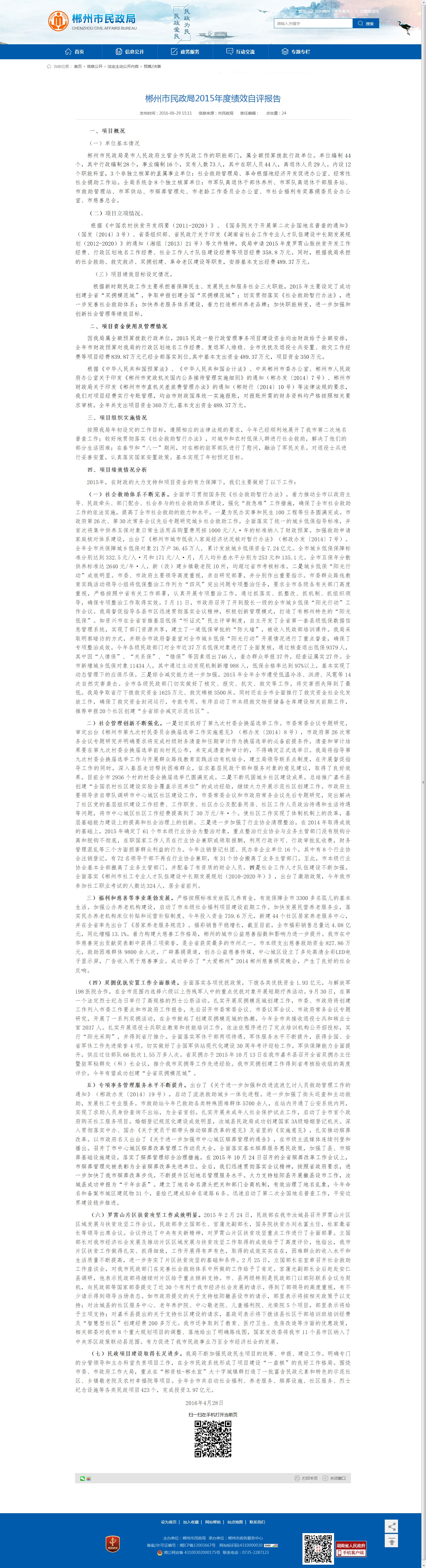 根据新时期民政工作主要承担着保障民生、发展民主和服务社会三大职能,2015年主要设定了成功创建全省“双拥模范城”,争取申报创建全国“双拥模范城”;切实贯彻落实《社会救助暂行办法》,进一步完善社会救助体系;加快养老服务体系建设,着力打造郴州养老品牌;加快职能转变,进一步加强和创新社会管理等绩效目标。