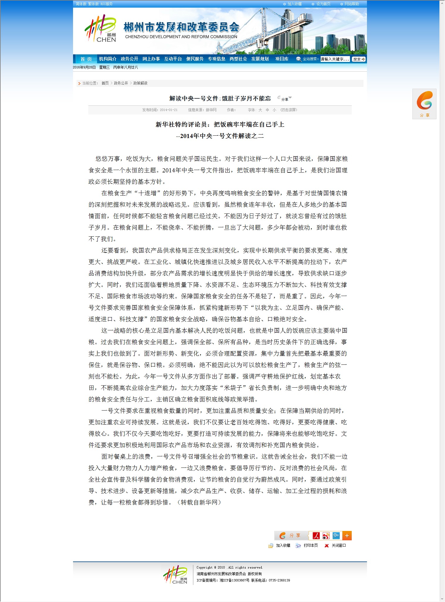 悠悠万事,吃饭为大,粮食问题关乎国运民生。对于我们这样一个人口大国来说,保障国家粮食安全是一个永恒的主题。2014年中央一号文件指出,把饭碗牢牢端在自己手上,是我们治国理政必须长期坚持的基本方针。