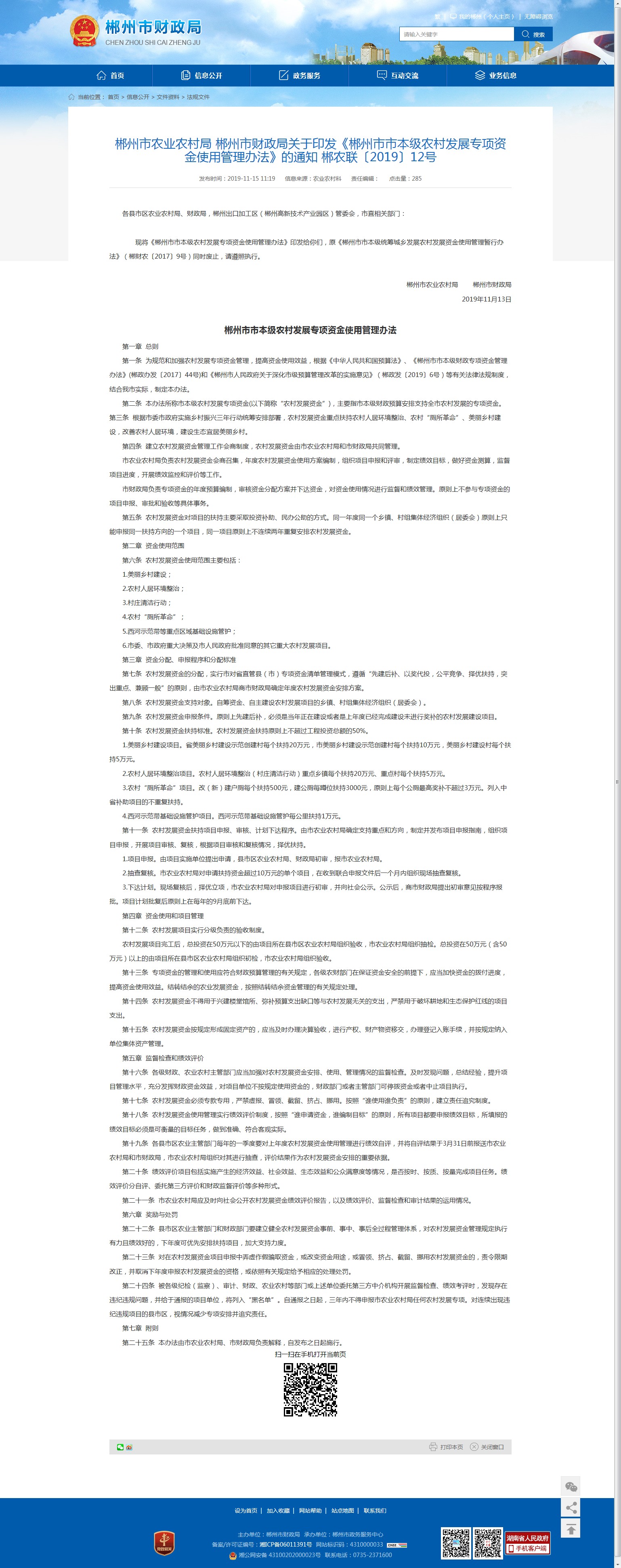 ????现将《郴州市市本级农村发展专项资金使用管理办法》印发给你们,原《郴州市市本级统筹城乡发展农村发展资金使用管理暂行办法》(郴财农〔2017〕9号)同时废止,请遵照执行。