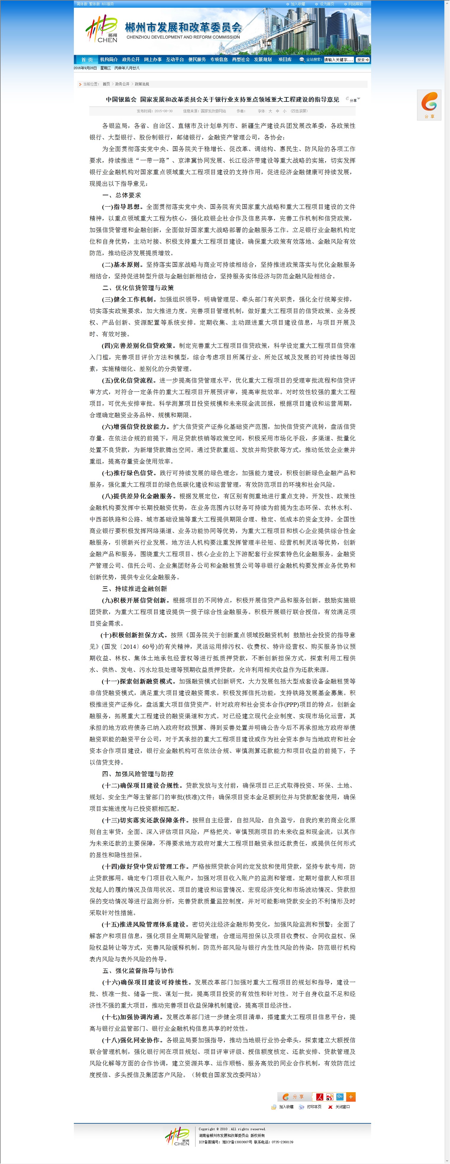 为全面贯彻落实党中央、国务院关于稳增长、促改革、调结构、惠民生、防风险的各项工作要求,持续推进“一带一路”、京津冀协同发展、长江经济带建设等重大战略的实施,切实发挥银行业金融机构对国家重点领域重大工程项目建设的支持作用,促进经济金融健康可持续发展,现提出以下指导意见: