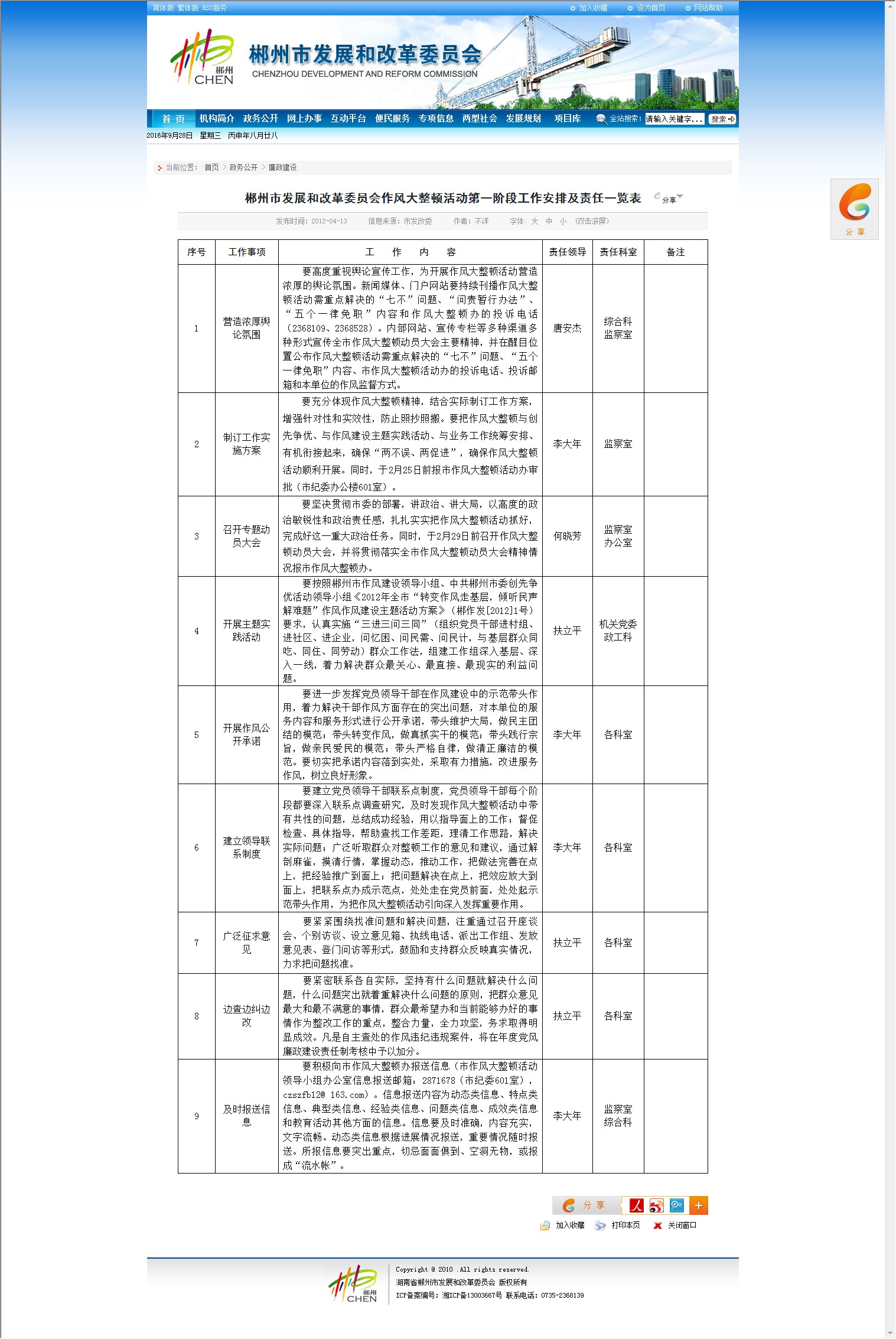 要按照郴州市作风建设领导小组、中共郴州市委创先争优活动领导小组《2012年全市“转变作风走基层,倾听民声解难题”作风作风建设主题活动方案》(郴作发[2012]1号)要求,认真实施“三进三问三同”(组织党员干部进村组、进社区、进企业,问忆困、问民需、问民计,与基层群众同吃、同住、同劳动)群众工作法,组建工作组深入基层、深入一线,着力解决群众最关心、最直接、最现实的利益问题。 |