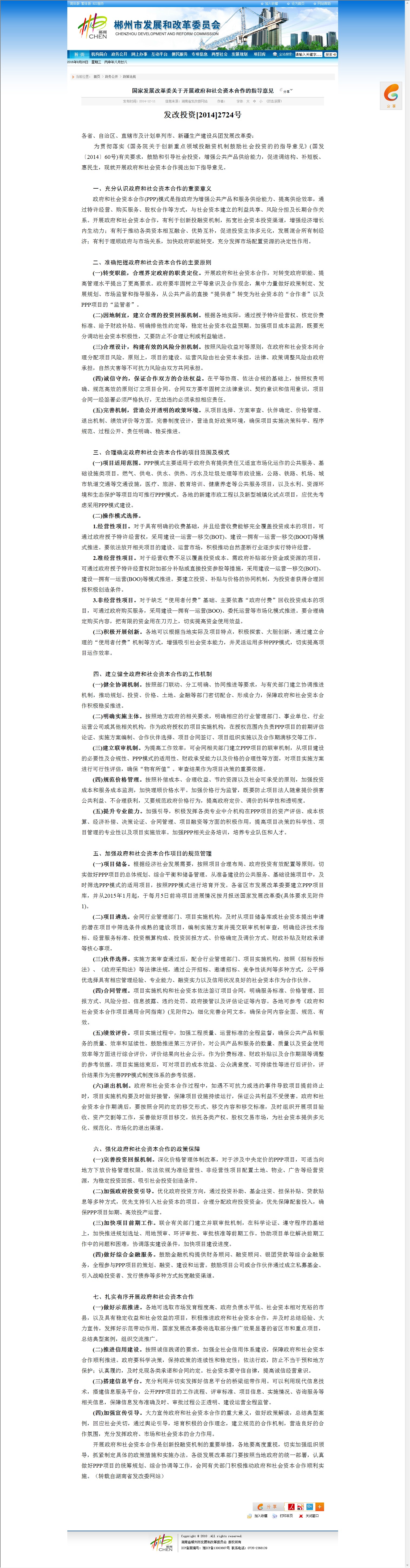 开展政府和社会资本合作是创新投融资机制的重要举措,各地要高度重视,切实加强组织领导,抓紧制定具体的政策措施和实施办法。各级发展改革部门要按照当地政府的统一部署,认真做好PPP项目的统筹规划、综合协调等工作,会同有关部门积极推动政府和社会资本合作顺利实施。(转载自湖南省发改委网站)