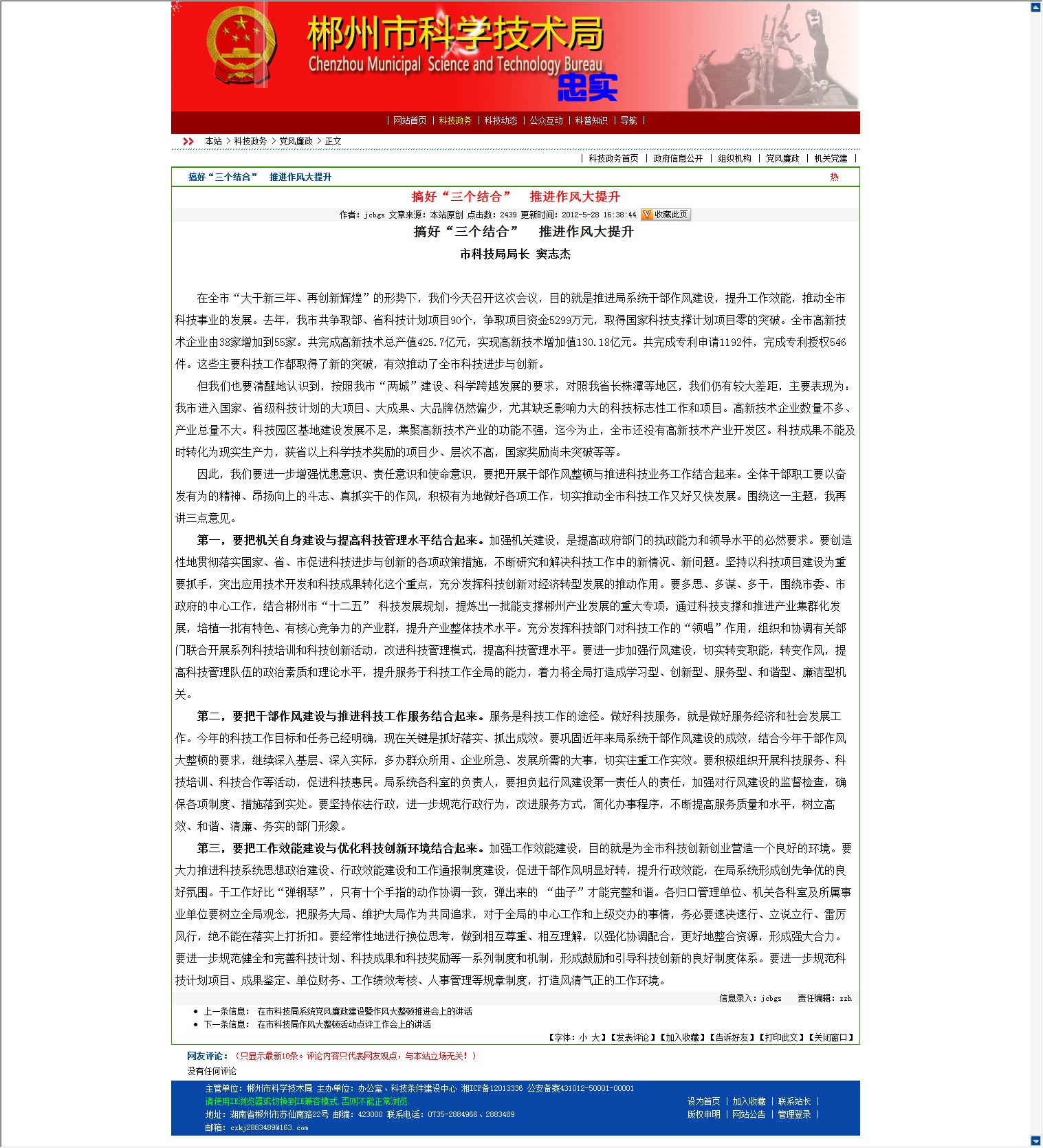 第一,要把机关自身建设与提高科技管理水平结合起来。加强机关建设,是提高政府部门的执政能力和领导水平的必然要求。要创造性地贯彻落实国家、省、市促进科技进步与创新的各项政策措施,不断研究和解决科技工作中的新情况、新问题。坚持以科技项目建设为重要抓手,突出应用技术开发和科技成果转化这个重点,充分发挥科技创新对经济转型发展的推动作用。要多思、多谋、多干,围绕市委、市政府的中心工作,结合郴州市“十二五” 科技发展规划,提炼出一批能支撑郴州产业发展的重大专项,通过科技支撑和推进产业集群化发展,培植一批有特色、有核心竞争力的产业群,提升产业整体技术水平。充分发挥科技部门对科技工作的“领唱”作用,组织和协调有关部门联合开展系列科技培训和科技创新活动,改进科技管理模式,提高科技管理水平。要进一步加强行风建设,切实转变职能,转变作风,提高科技管理队伍的政治素质和理论水平,提升服务于科技工作全局的能力,着力将全局打造成学习型、创新型、服务型、和谐型、廉洁型机关。