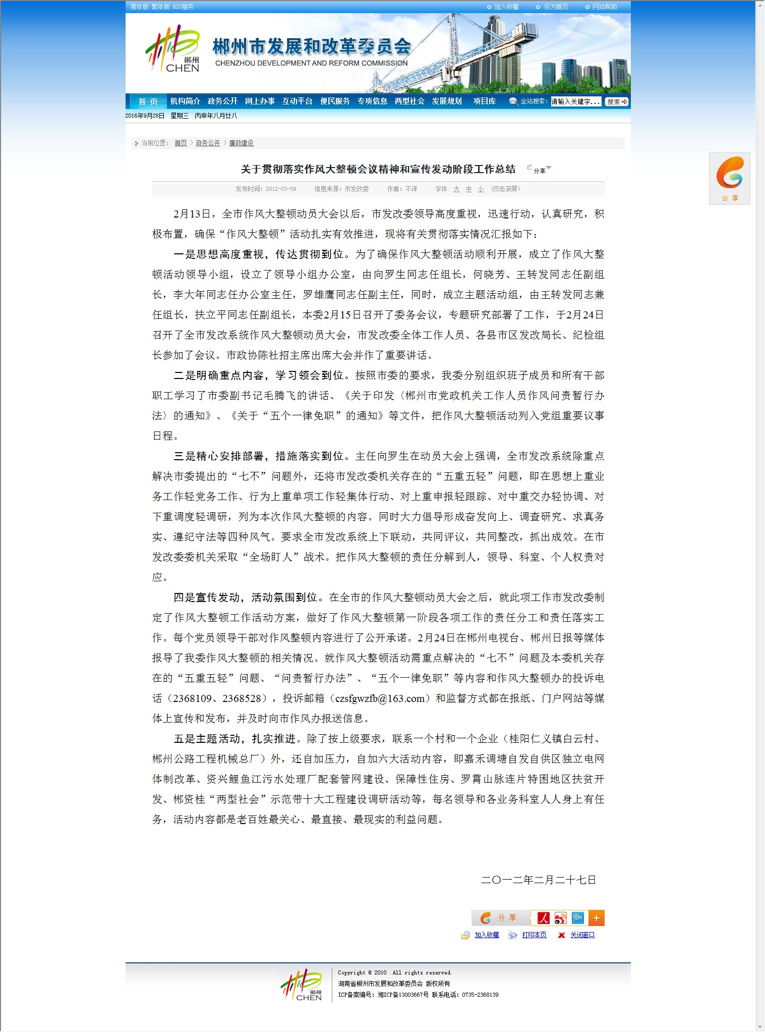 四是宣传发动,活动氛围到位。在全市的作风大整顿动员大会之后,就此项工作市发改委制定了作风大整顿工作活动方案,做好了作风大整顿第一阶段各项工作的责任分工和责任落实工作。每个党员领导干部对作风整顿内容进行了公开承诺。2月24日在郴州电视台、郴州日报等媒体报导了我委作风大整顿的相关情况。就作风大整顿活动需重点解决的“七不”问题及本委机关存在的“五重五轻”问题、“问责暂行办法”、“五个一律免职”等内容和作风大整顿办的投诉电话(2368109、2368528),投诉邮箱(czsfgwzfb@163.com)和监督方式都在报纸、门户网站等媒体上宣传和发布,并及时向市作风办报送信息。