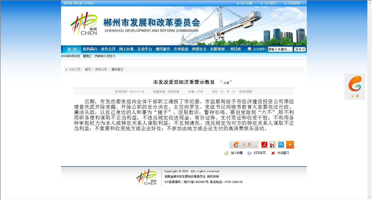 近期,市发改委党组向全体干部职工通报了市纪委、市监察局给予市经济建设投资公司原经理曾庆武开除党籍、开除公职的处分决定。主任向罗生、党组书记何晓芳教育大家要依法行政、廉洁从政,以自己身边的人和事为“镜子”,汲取教训,警钟长鸣。要自觉做到“六不”,即不利用职务便利谋取不正当利益;不违反规定收送现金、有价证券、支付凭证和收受干股;不利用各种审批权力为本人或特定关系人谋取利益;不互相请托、违反规定为对方的特定关系人谋取不正当利益;不索要和收受地方或企业好处;不参加由地方或企业支付的高消费娱乐活动。