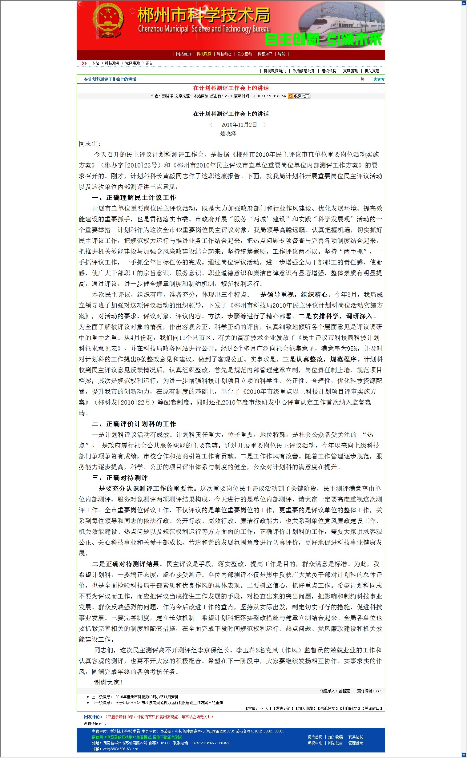 今天召开的民主评议计划科测评工作会,是根据《郴州市2010年民主评议市直单位重要岗位活动实施方案》(郴办字[2010]23号)和《郴州市2010年民主评议市直单位重要岗位单位内部测评工作方案》的要求召开的。刚才,计划科科长黄毅同志作了述职述廉报告。下面,就我局计划科开展重要岗位民主评议活动以及这次单位内部测评讲三点意见:
