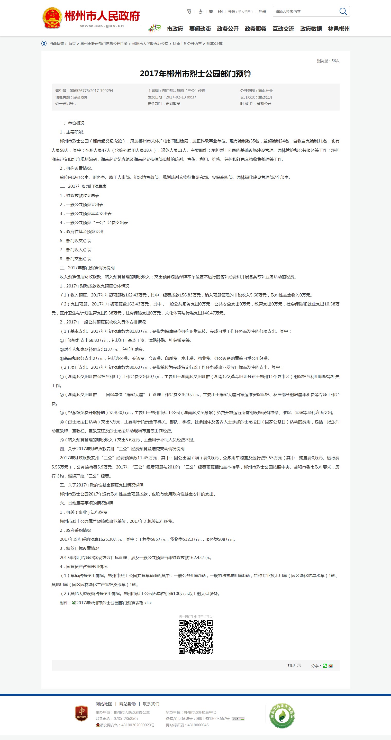 郴州市烈士公园属差额拨款事业单位,2017年无机关运行经费。