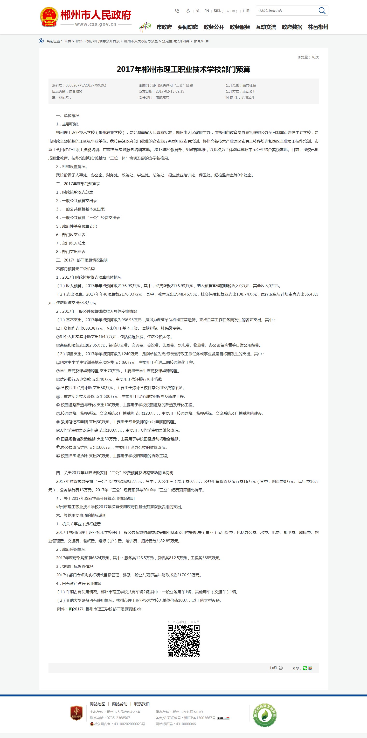2017年郴州市理工职业技术学校使用一般公共预算财政拨款安排的基本支出中的机关(事业)运行经费,包括办公费、水费、电费、邮电费、取暖费、物业管理费、交通费、差旅费、维修(护)费、培训费、招待费等共82.85万元。