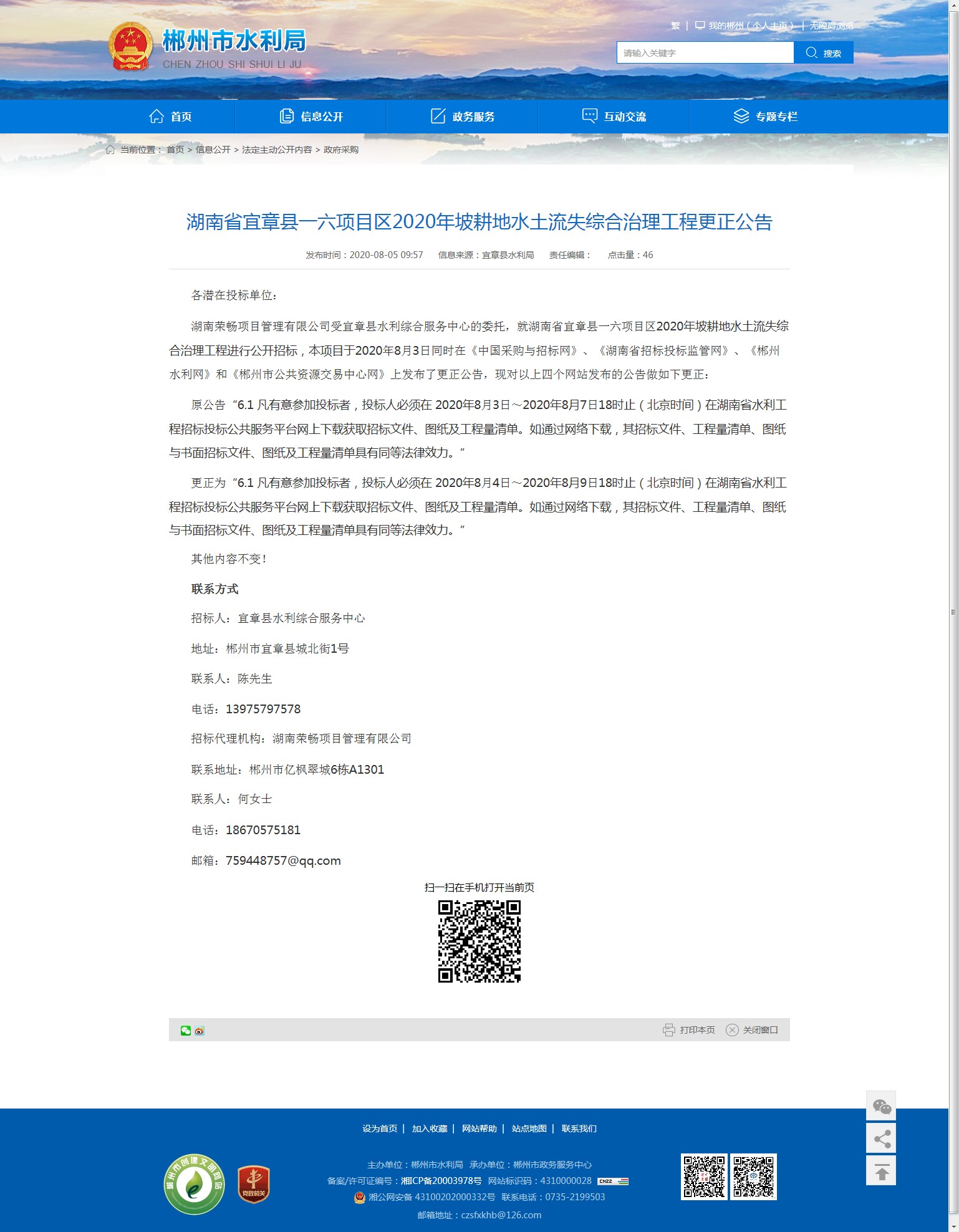 湖南荣畅项目管理有限公司受宜章县水利综合服务中心的委托,就湖南省宜章县一六项目区2020年坡耕地水土流失综合治理工程进行公开招标,本项目于2020年8月3日同时在《中国采购与招标网》、《湖南省招标投标监管网》、《郴州水利网》和《郴州市公共资源交易中心网》上发布了更正公告,现对以上四个网站发布的公告做如下更正: