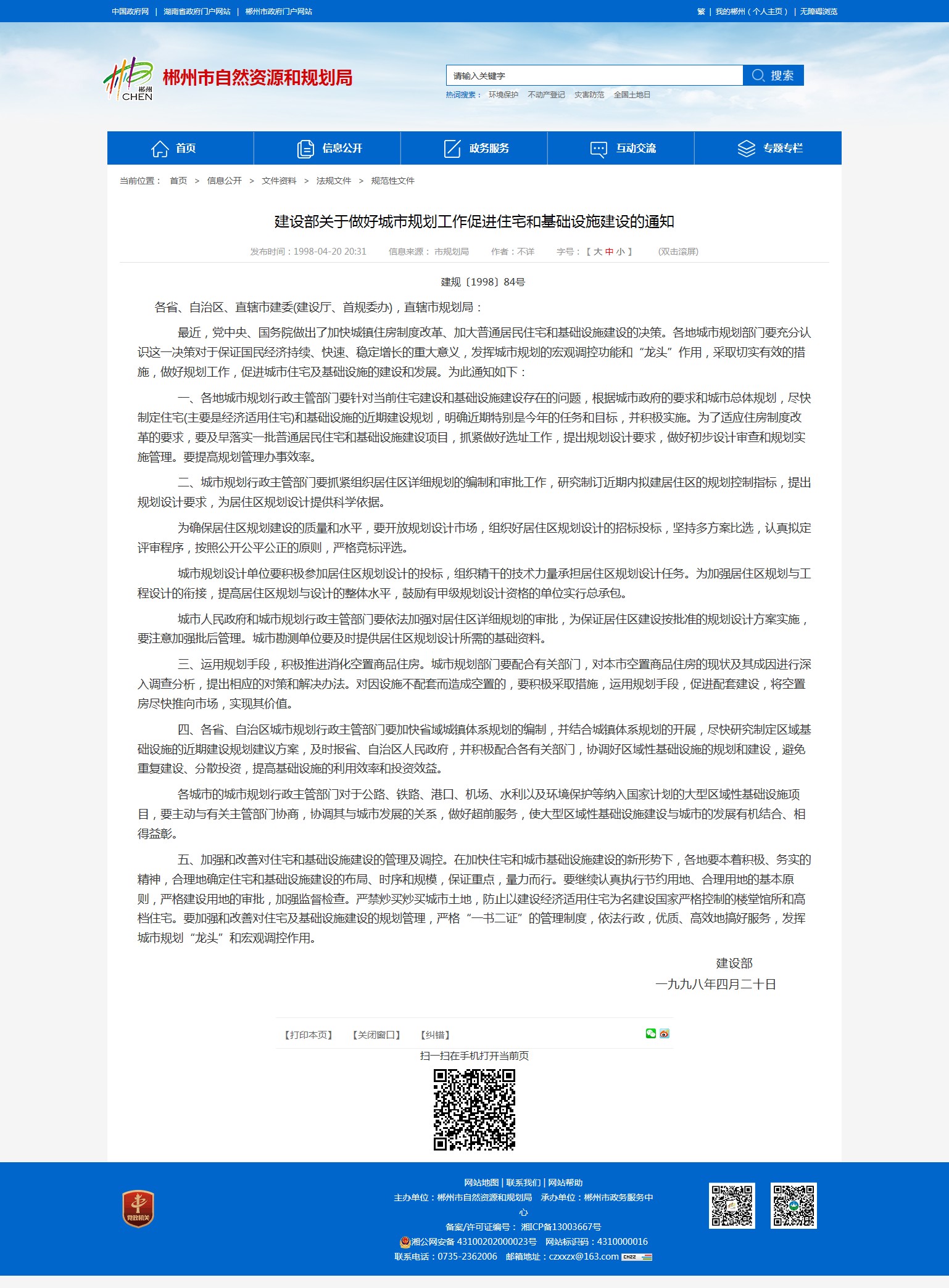 最近,党中央、国务院做出了加快城镇住房制度改革、加大普通居民住宅和基础设施建设的决策。各地城市规划部门要充分认识这一决策对于保证国民经济持续、快速、稳定增长的重大意义,发挥城市规划的宏观调控功能和“龙头”作用,采取切实有效的措施,做好规划工作,促进城市住宅及基础设施的建设和发展。为此通知如下: