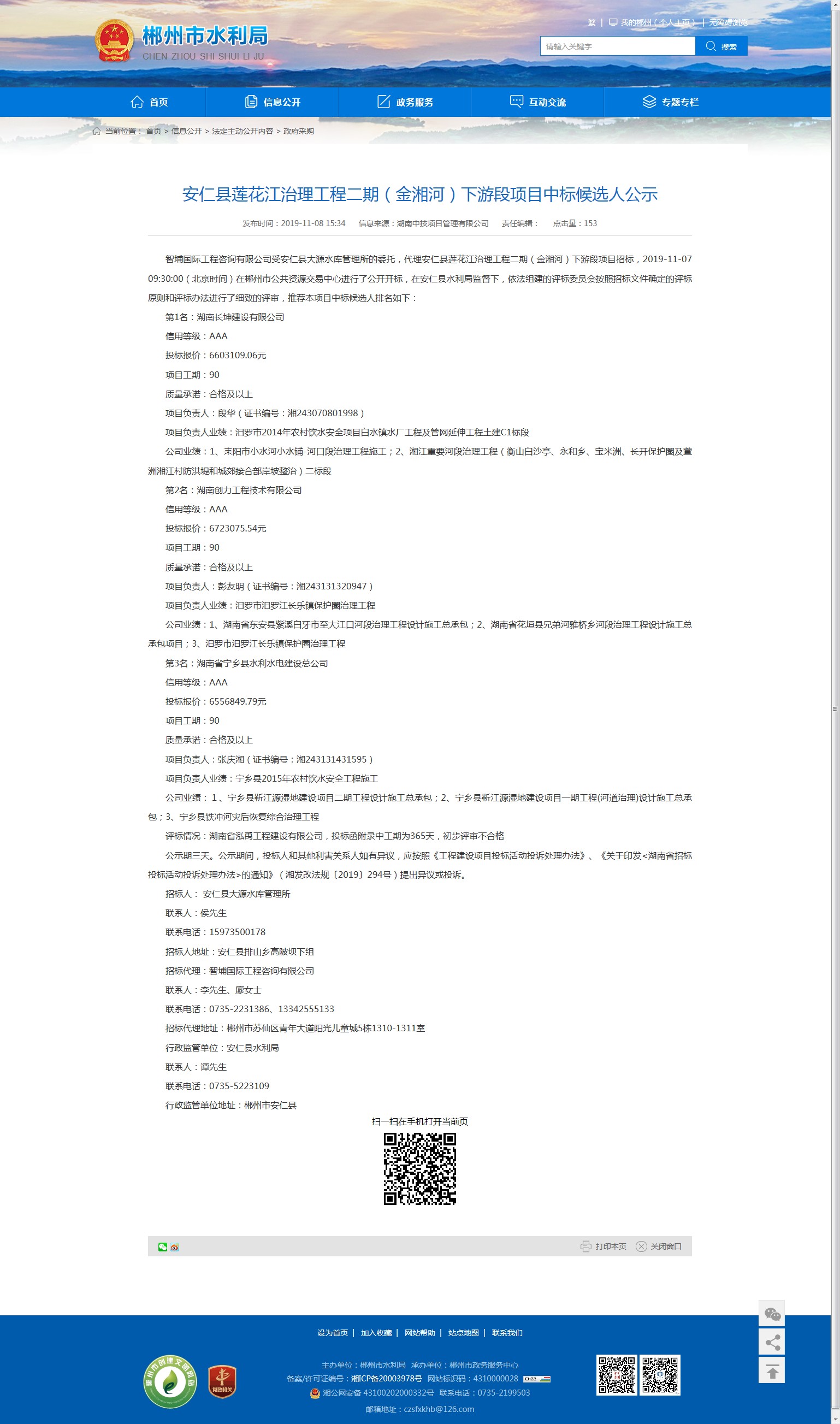智埔国际工程咨询有限公司受安仁县大源水库管理所的委托,代理安仁县莲花江治理工程二期(金湘河)下游段项目招标,2019-11-07 09:30:00(北京时间)在郴州市公共资源交易中心进行了公开开标,在安仁县水利局监督下,依法组建的评标委员会按照招标文件确定的评标原则和评标办法进行了细致的评审,推荐本项目中标候选人排名如下: