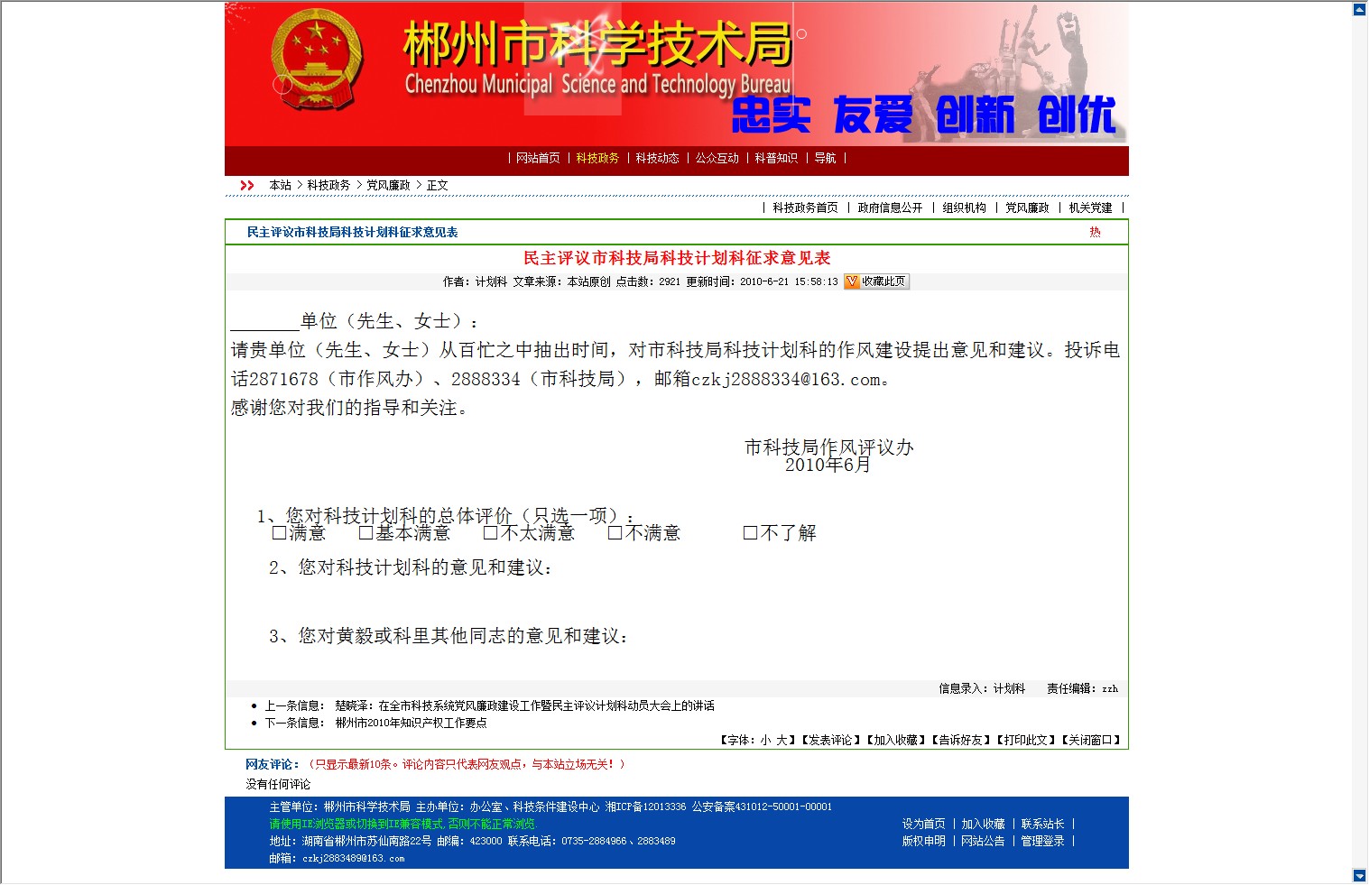 请贵单位(先生、女士)从百忙之中抽出时间,对市科技局科技计划科的作风建设提出意见和建议。投诉电话2871678(市作风办)、2888334(市科技局),邮箱czkj2888334@163.com。