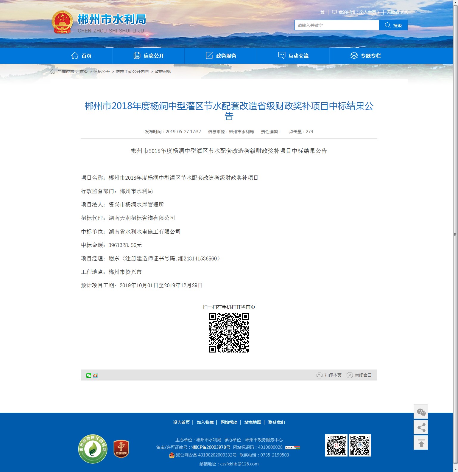 郴州市2018年度杨洞中型灌区节水配套改造省级财政奖补项目中标结果公告
