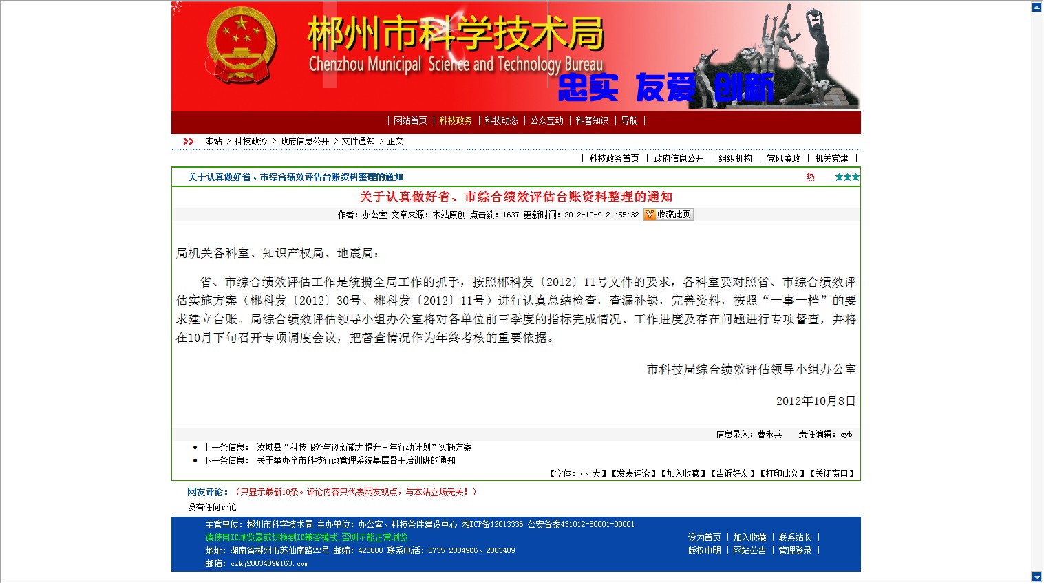 省、市综合绩效评估工作是统揽全局工作的抓手,按照郴科发〔2012〕11号文件的要求,各科室要对照省、市综合绩效评估实施方案(郴科发〔2012〕30号、郴科发〔2012〕11号)进行认真总结检查,查漏补缺,完善资料,按照“一事一档”的要求建立台账。局综合绩效评估领导小组办公室将对各单位前三季度的指标完成情况、工作进度及存在问题进行专项督查,并将在10月下旬召开专项调度会议,把督查情况作为年终考核的重要依据。