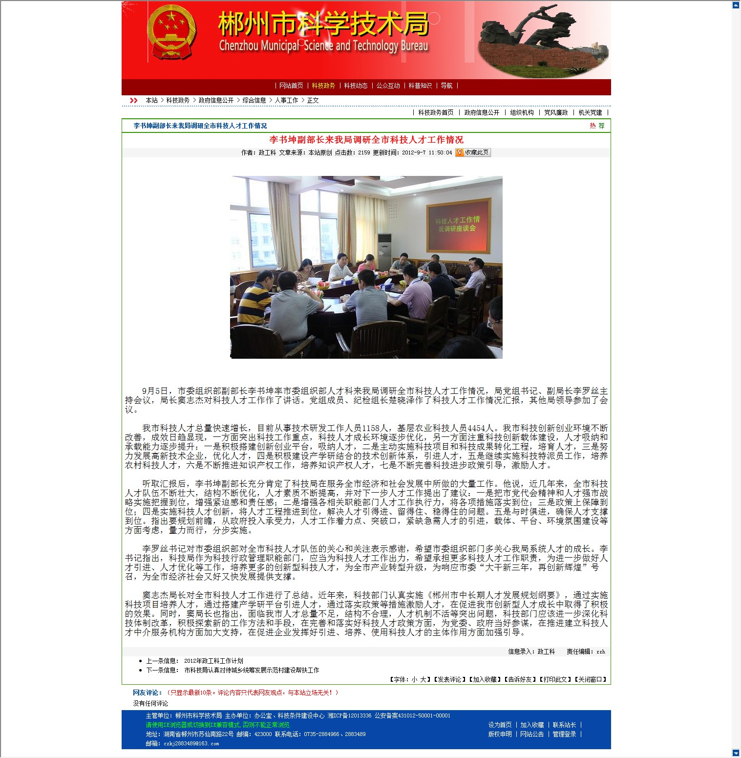 李罗丝书记对市委组织部对全市科技人才队伍的关心和关注表示感谢,希望市委组织部门多关心我局系统人才的成长。李书记指出,科技局作为科技行政管理职能部门,应当为科技人才工作出力,希望承担更多科技人才工作职责,为进一步做好人才引进、人才优化等工作,培养更多的创新型科技人才,为全市产业转型升级,为响应市委“大干新三年,再创新辉煌”号召,为全市经济社会又好又快发展提供支撑。