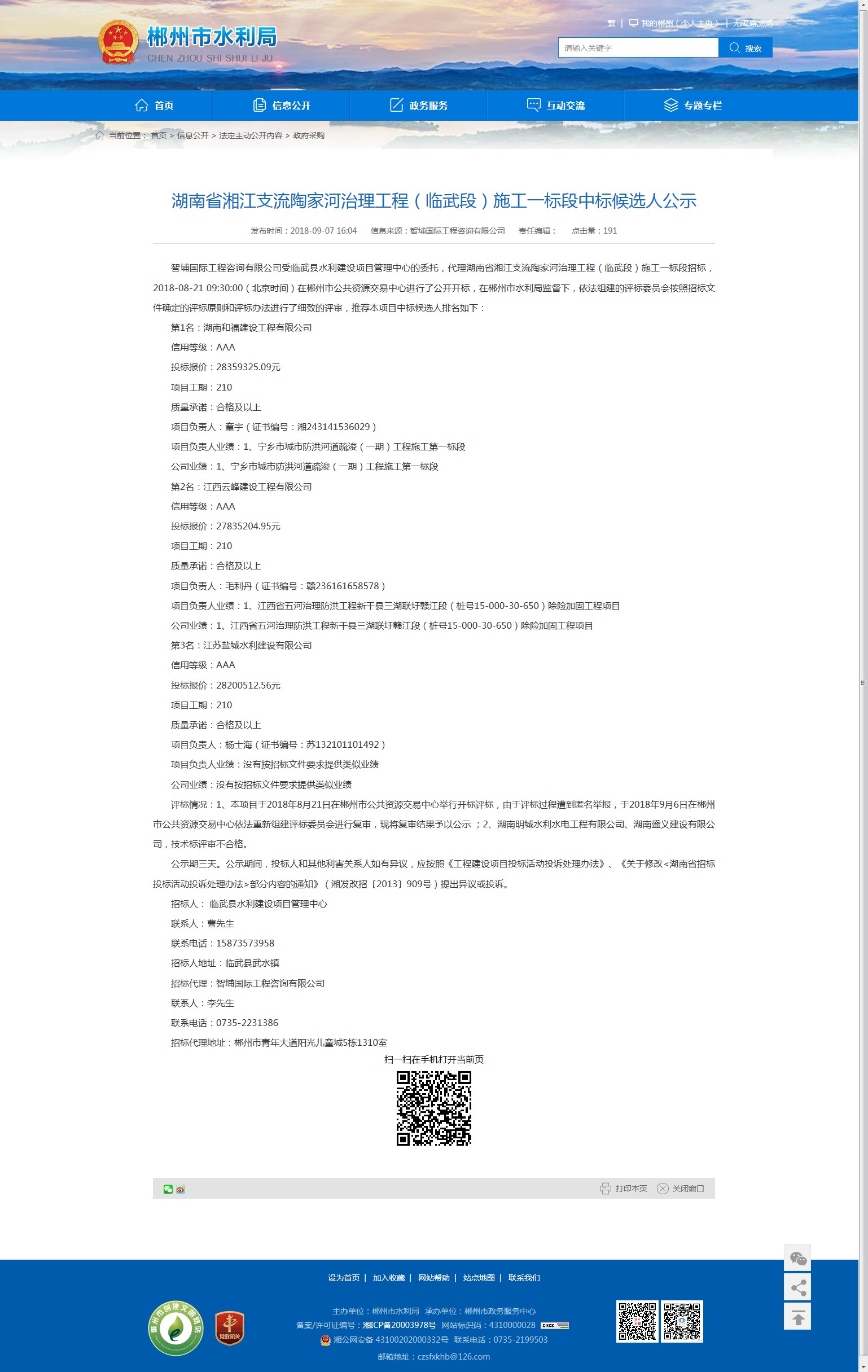 评标情况:1、本项目于2018年8月21日在郴州市公共资源交易中心举行开标评标,由于评标过程遭到匿名举报,于2018年9月6日在郴州市公共资源交易中心依法重新组建评标委员会进行复审,现将复审结果予以公示 ;2、湖南明城水利水电工程有限公司、湖南盛义建设有限公司,技术标评审不合格。