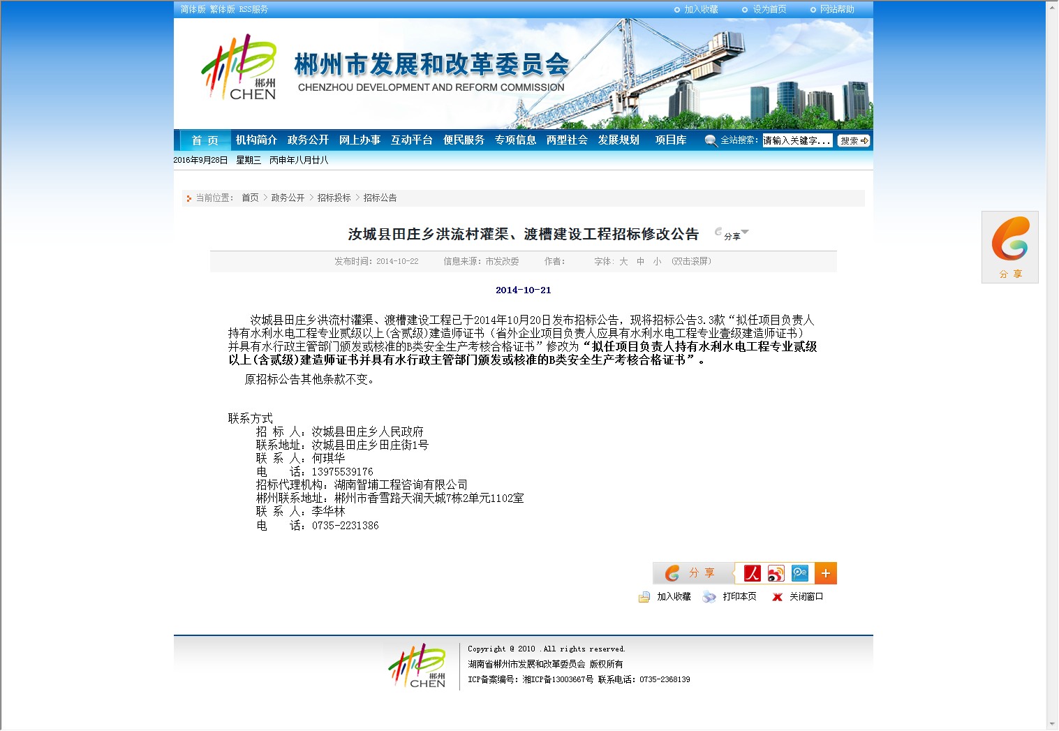 汝城县田庄乡洪流村灌渠、渡槽建设工程已于2014年10月20日发布招标公告,现将招标公告3.3款“拟任项目负责人持有水利水电工程专业贰级以上(含贰级)建造师证书(省外企业项目负责人应具有水利水电工程专业壹级建造师证书)并具有水行政主管部门颁发或核准的B类安全生产考核合格证书”修改为“拟任项目负责人持有水利水电工程专业贰级以上(含贰级)建造师证书并具有水行政主管部门颁发或核准的B类安全生产考核合格证书”。 原招标公告其他条款不变。 联系方式 招 标 人:汝城县田庄乡人民政府 联系地址:汝城县田庄乡田庄街1号 联 系 人:何琪华 电 话:13975539176 招标代理机构:湖南智埔工程咨询有限公司 郴州联系地址:郴州市香雪路天润天城7栋2单元1102室 联 系 人:李华林 电 话:0735-2231386 |