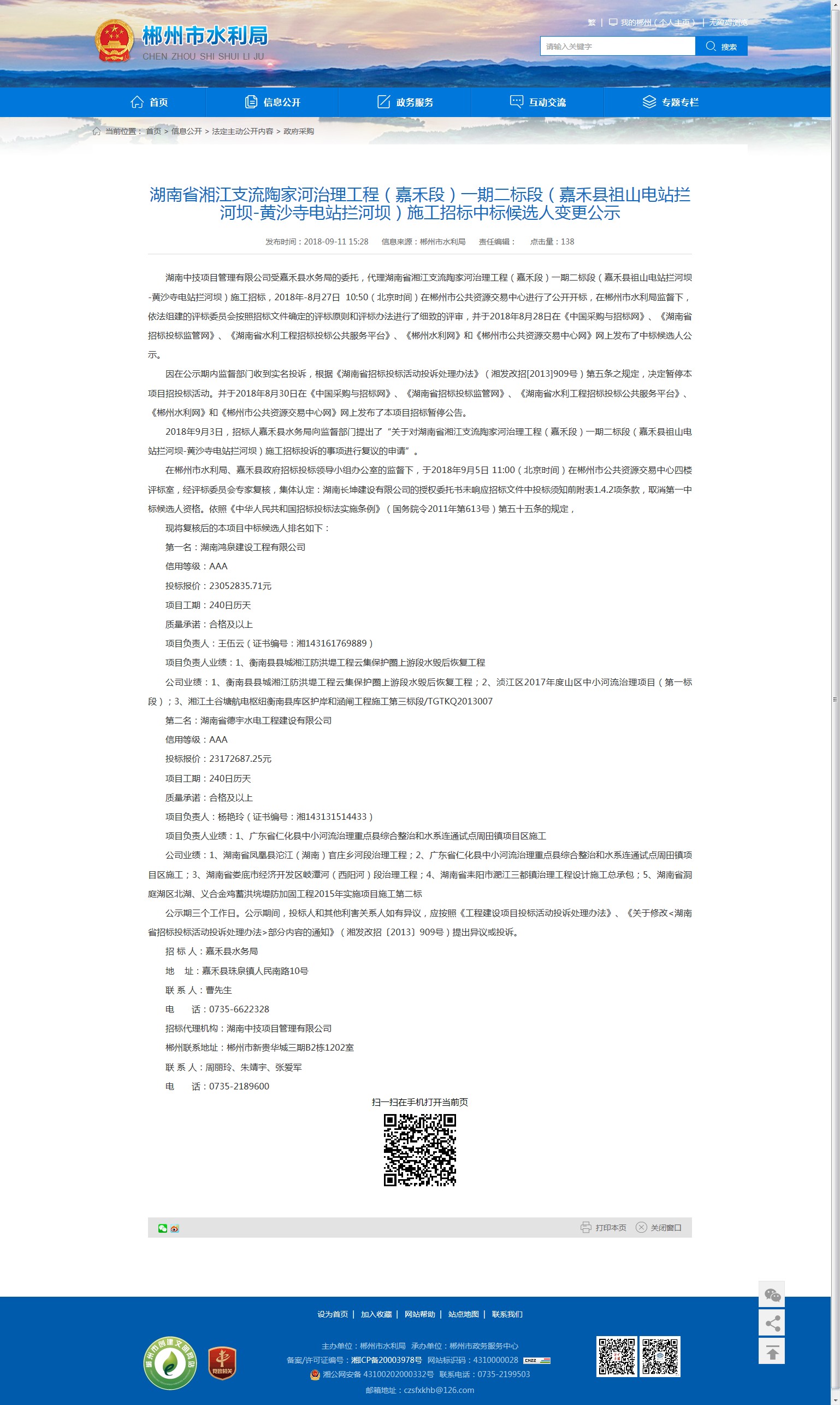 湖南中技项目管理有限公司受嘉禾县水务局的委托,代理湖南省湘江支流陶家河治理工程(嘉禾段)一期二标段(嘉禾县祖山电站拦河坝-黄沙寺电站拦河坝)施工招标,2018年-8月27日 10:50(北京时间)在郴州市公共资源交易中心进行了公开开标,在郴州市水利局监督下,依法组建的评标委员会按照招标文件确定的评标原则和评标办法进行了细致的评审,并于2018年8月28日在《中国采购与招标网》、《湖南省招标投标监管网》、《湖南省水利工程招标投标公共服务平台》、《郴州水利网》和《郴州市公共资源交易中心网》网上发布了中标候选人公示。