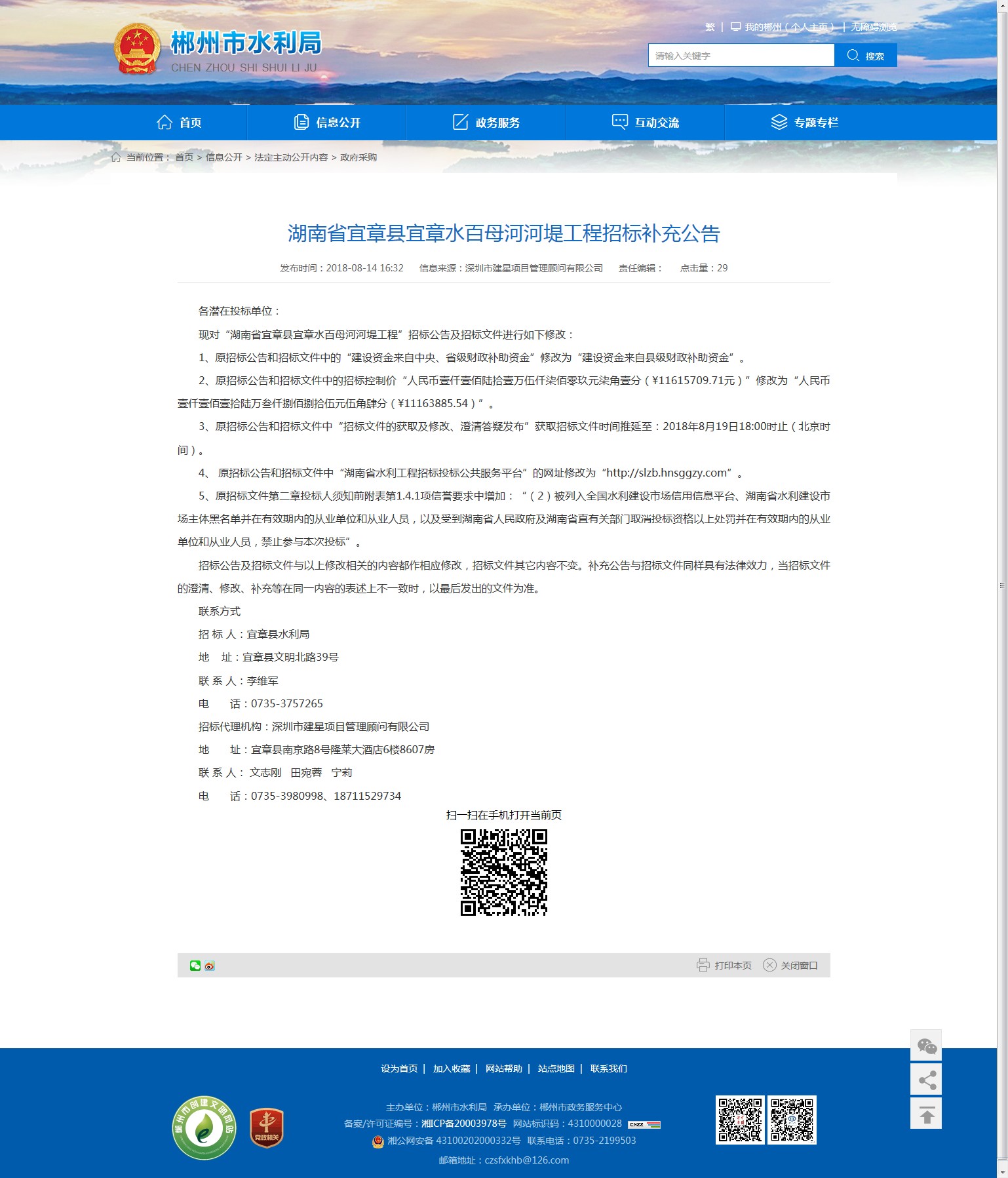 现对“湖南省宜章县宜章水百母河河堤工程”招标公告及招标文件进行如下修改: