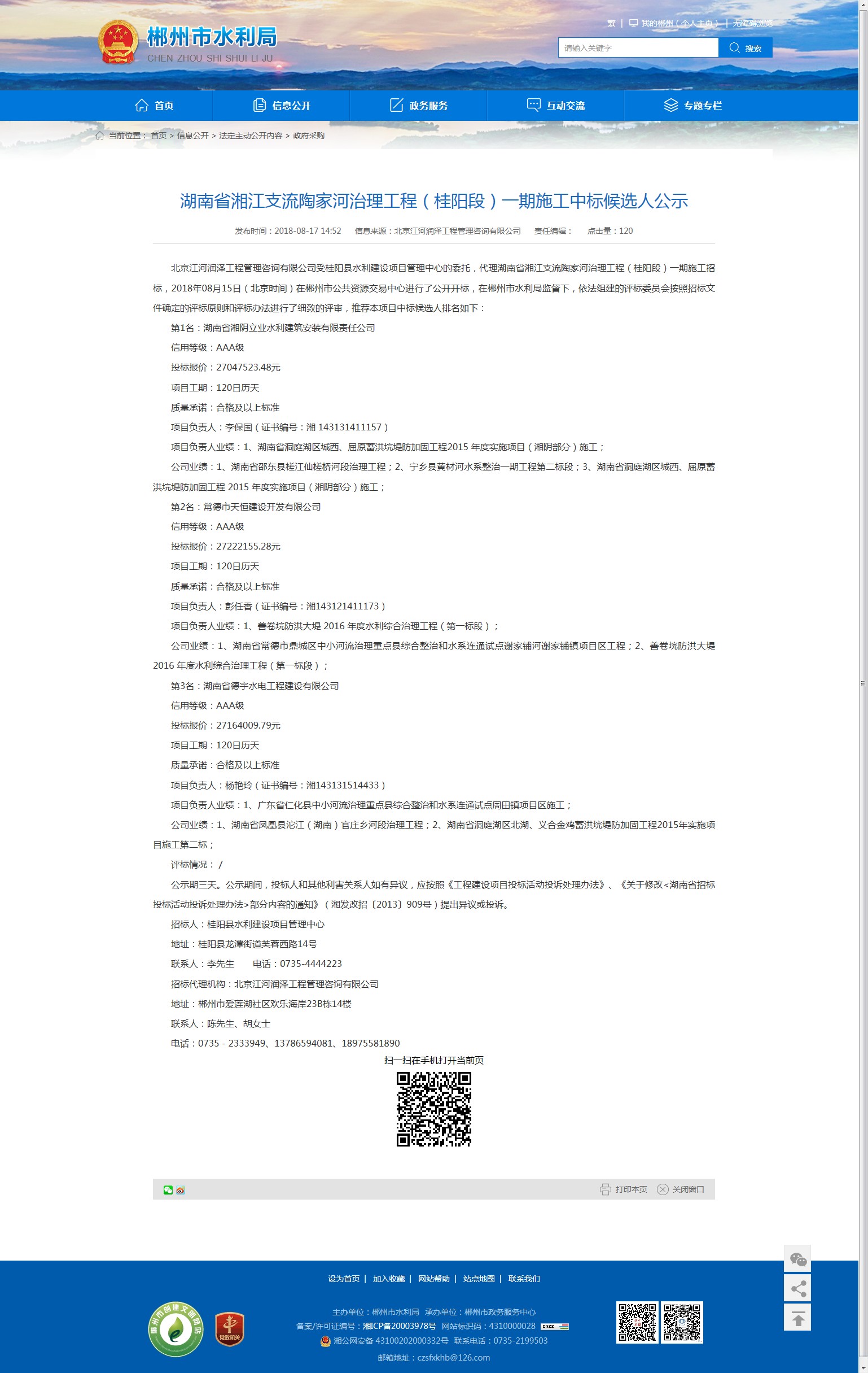 北京江河润泽工程管理咨询有限公司受桂阳县水利建设项目管理中心的委托,代理湖南省湘江支流陶家河治理工程(桂阳段)一期施工招标,2018年08月15日(北京时间)在郴州市公共资源交易中心进行了公开开标,在郴州市水利局监督下,依法组建的评标委员会按照招标文件确定的评标原则和评标办法进行了细致的评审,推荐本项目中标候选人排名如下: