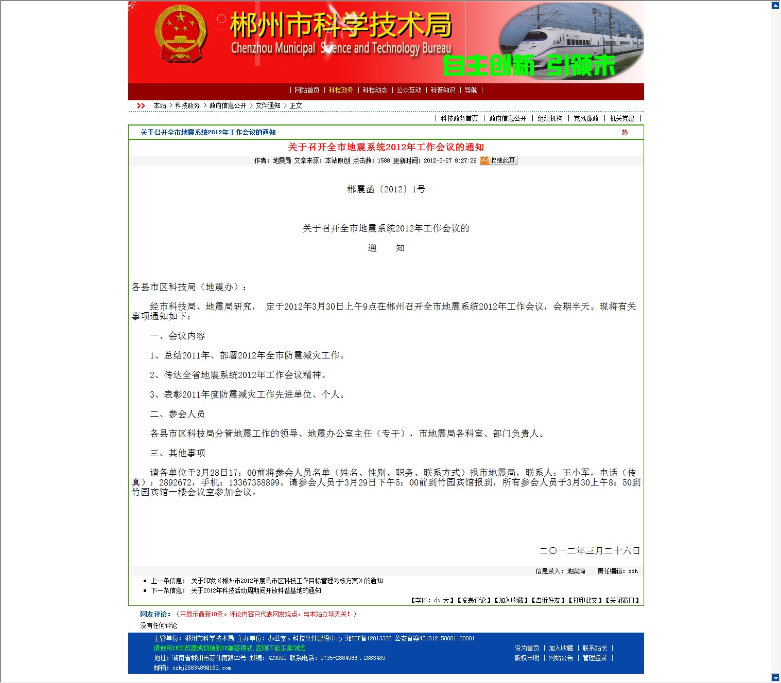 经市科技局、地震局研究, 定于2012年3月30日上午9点在郴州召开全市地震系统2012年工作会议,会期半天。现将有关事项通知如下:
