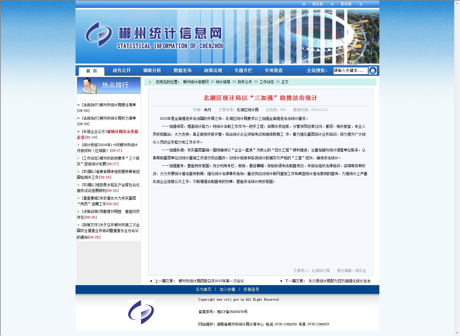 2015年是全面推进依法治国的开局之年,北湖区统计局要求以三加强全面推进法治统计建设。