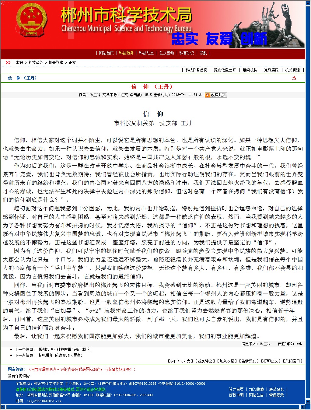 起初面对这个问题我感到十分困惑,为此,我的内心也开始动摇,特别是遇到挫折时也会埋怨命运,对自己的选择感到怀疑、对自己的人生感到困惑、甚至对将来感到茫然,这都是一种缺乏信仰的表现。然而,当我看到越来越多的人为了各种梦想而努力奋斗和拼搏的时候,我才恍然大悟,我所找寻的“信仰”,不正是这份对梦想和理想的执着,这里既有对中华民族伟大复兴中国梦的忠诚、也有对实现富民强市“郴州起飞”的期盼、更有为建设创新型城市实现科学跨越发展的不懈努力,正是这些梦想汇聚成一座座灯塔,照亮了前进的方向,为我们提供了最坚定的“信仰”。