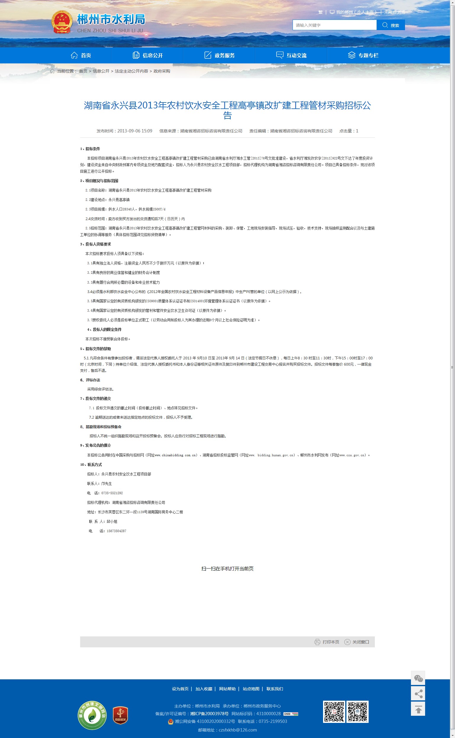 本招标公告同时在中国采购与招标网(网址www.chinabidding.com.cn)、湖南省招标投标监管网(网址www. bidding.hunan.gov.cn)、郴州市水利网发布(网址www.czs.gov.cn)。