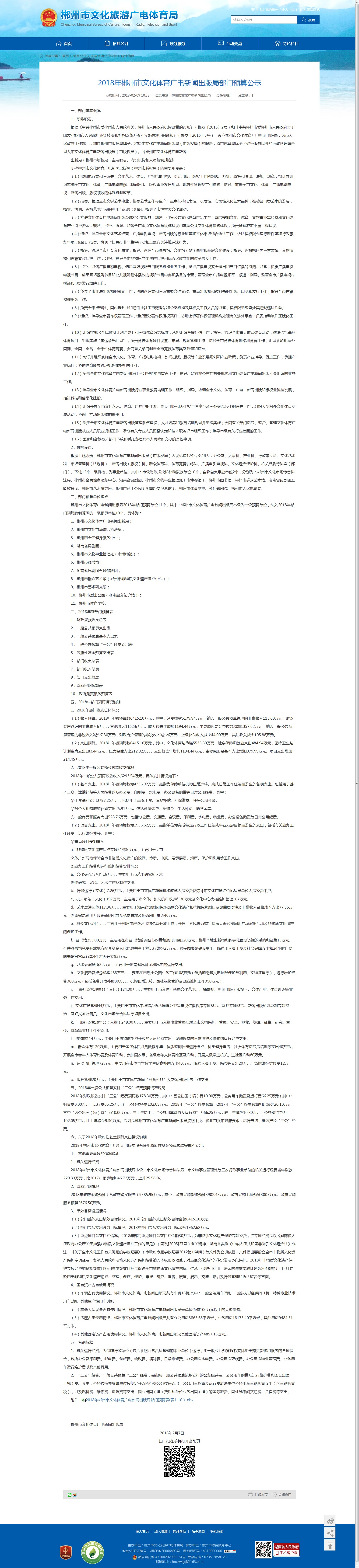 郴州市文化体育广电新闻出版局2018年部门预算单位11个,其中:郴州市文化体育广电新闻出版局本级为一级预算单位,纳入2018年部门预算编制范围的二级预算单位10个。具体为: