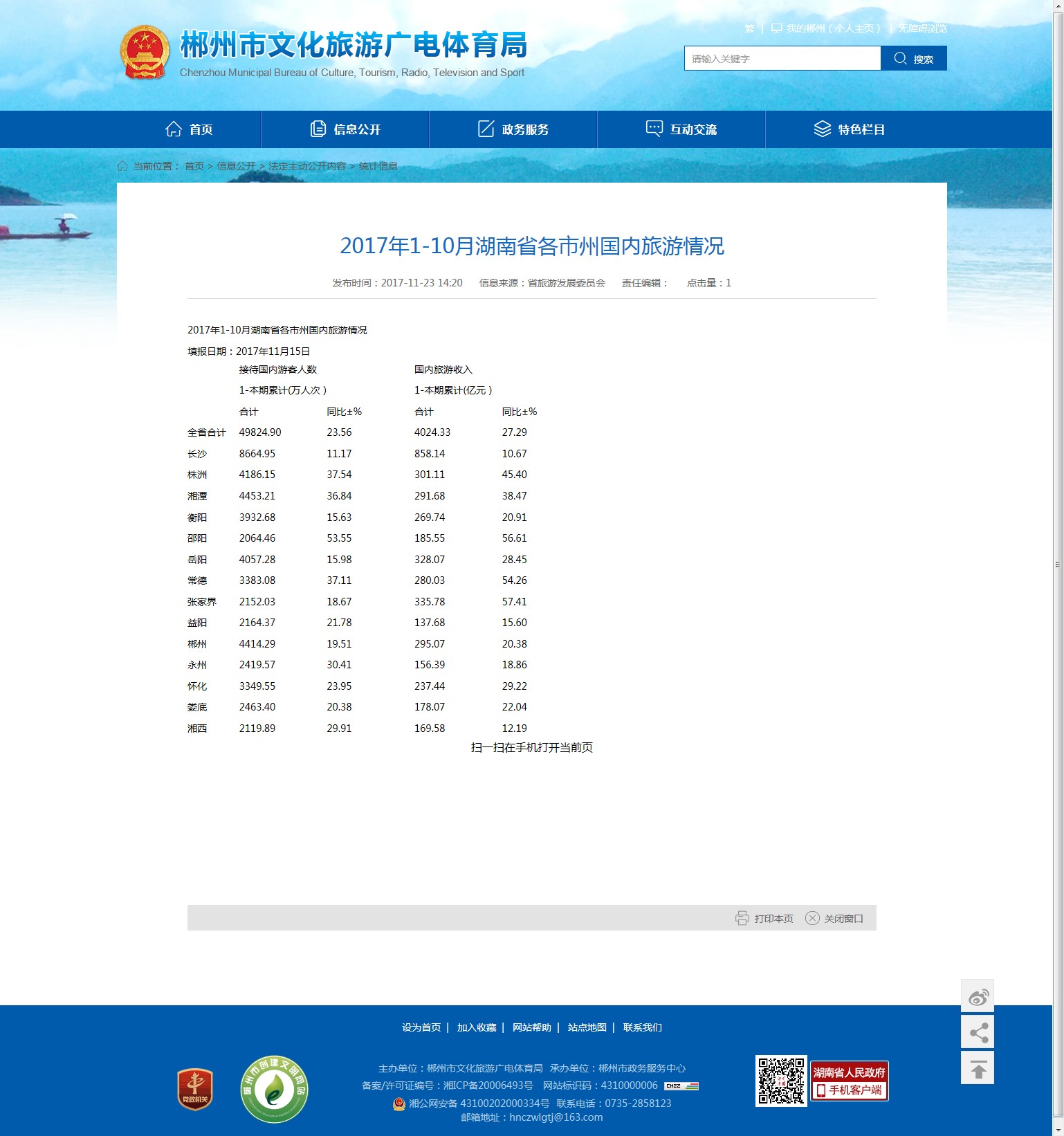 | 2017年1-10月湖南省各市州国内旅游情况 | ||||