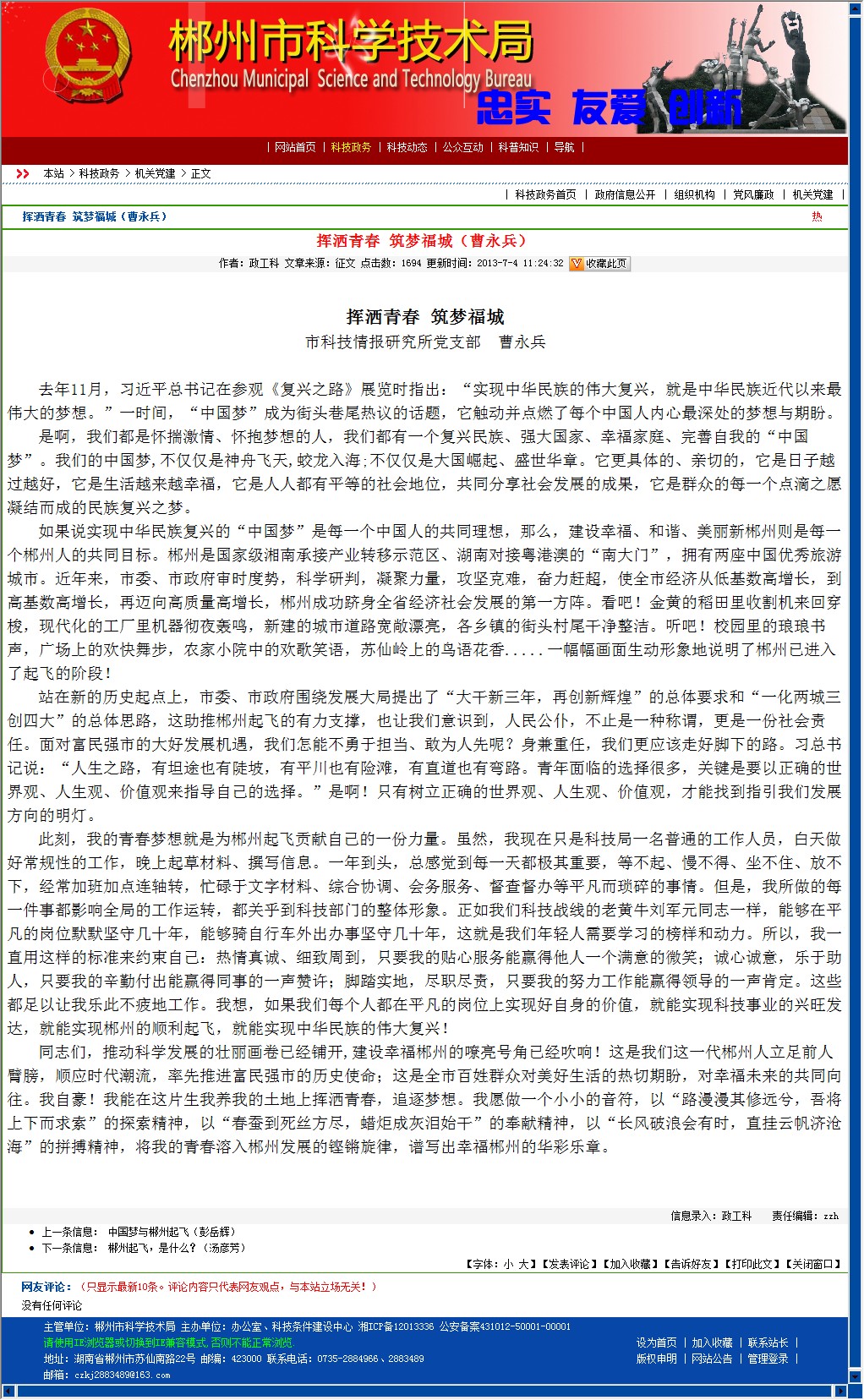 此刻,我的青春梦想就是为郴州起飞贡献自己的一份力量。虽然,我现在只是科技局一名普通的工作人员,白天做好常规性的工作,晚上起草材料、撰写信息。一年到头,总感觉到每一天都极其重要,等不起、慢不得、坐不住、放不下,经常加班加点连轴转,忙碌于文字材料、综合协调、会务服务、督查督办等平凡而琐碎的事情。但是,我所做的每一件事都影响全局的工作运转,都关乎到科技部门的整体形象。正如我们科技战线的老黄牛刘军元同志一样,能够在平凡的岗位默默坚守几十年,能够骑自行车外出办事坚守几十年,这就是我们年轻人需要学习的榜样和动力。所以,我一直用这样的标准来约束自己:热情真诚、细致周到,只要我的贴心服务能赢得他人一个满意的微笑;诚心诚意,乐于助人,只要我的辛勤付出能赢得同事的一声赞许;脚踏实地,尽职尽责,只要我的努力工作能赢得领导的一声肯定。这些都足以让我乐此不疲地工作。我想,如果我们每个人都在平凡的岗位上实现好自身的价值,就能实现科技事业的兴旺发达,就能实现郴州的顺利起飞,就能实现中华民族的伟大复兴!