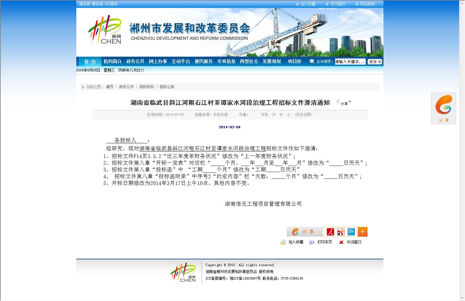 经研究,现对湖南省临武县斜江河粗石江村至谭家水河段治理工程招标文件作如下澄清:
