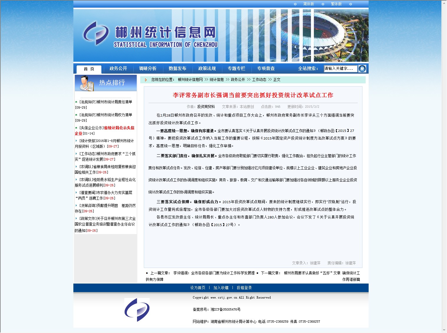 各县市区发改委主任、统计局局长、重点办主任和市直部门负责人280人参加会议,会议下发了《关于认真开展投资统计改革试点工作的通知》(郴政办函【2015】27号)。