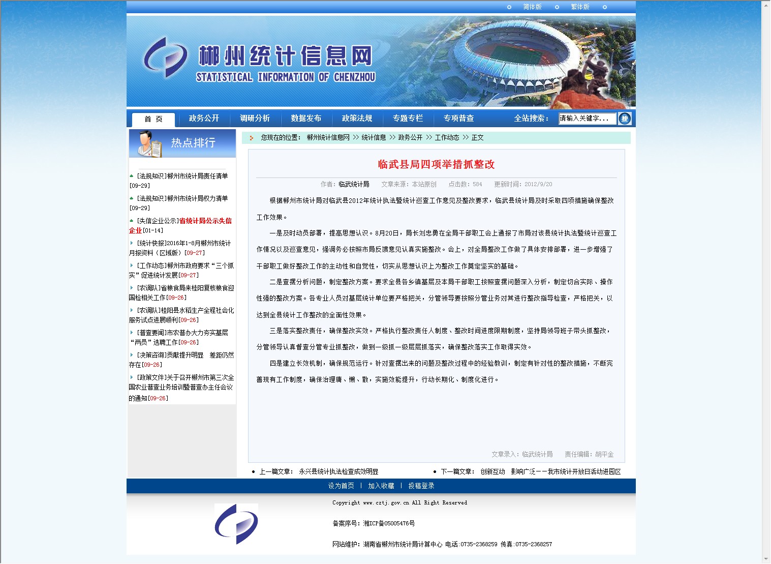 根据郴州市统计局对临武县2012年统计执法暨统计巡查工作意见及整改要求,临武县统计局及时采取四项措施确保整改工作效果。