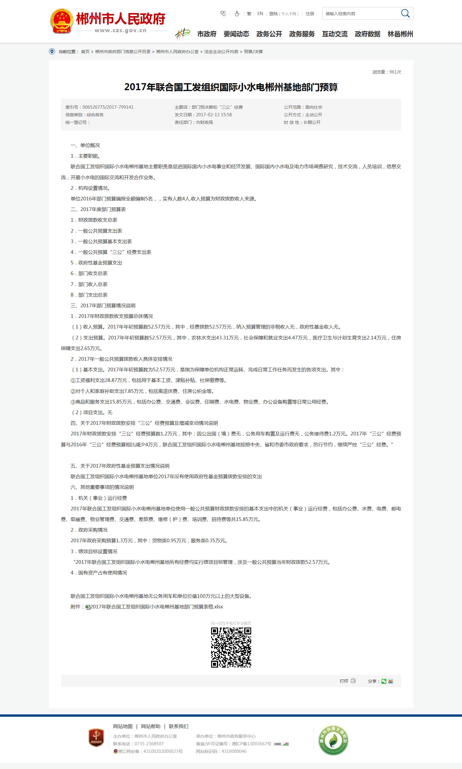 “2017年联合国工发组织国际小水电郴州基地所有经费均实行绩效目标管理,涉及一般公共预算当年财政拨款52.57万元。