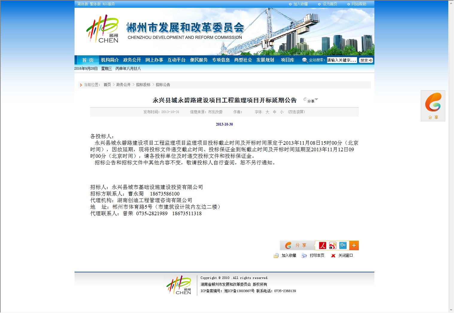 各投标人: 永兴县城永碧路建设项目工程监理项目监理项目投标截止时间及开标时间原定于2013年11月08日15时00分(北京时间),因故延期,现将投标文件递交截止时间、投标保证金到帐截止时间及开标时间延期至2013年11月12日09 时00分(北京时间),请各投标单位及时递交投标文件和投标保证金。 招标公告和招标文件中其他内容不变,敬请投标人自行查阅,恕不另行通知。