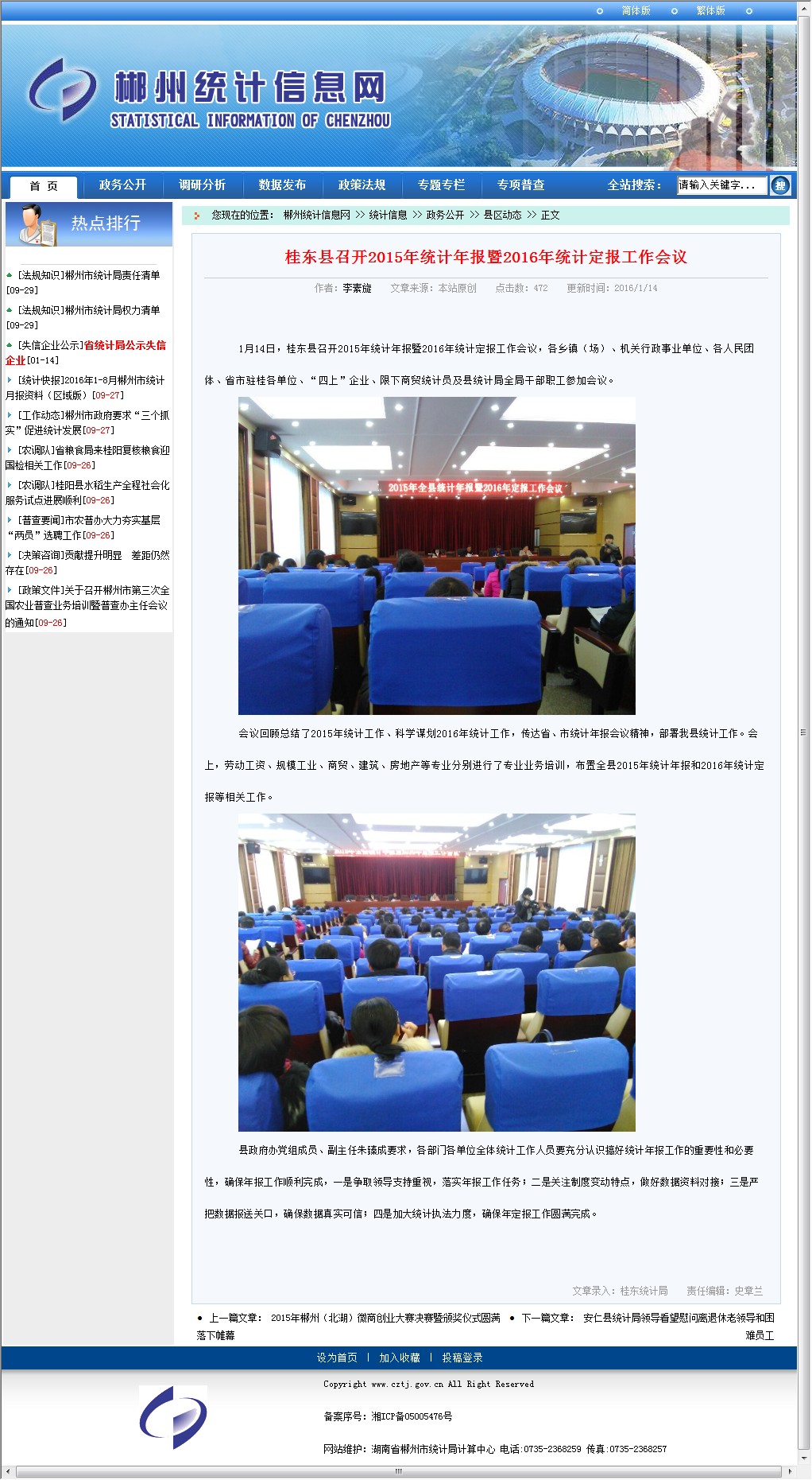 1月14日,桂东县召开2015年统计年报暨2016年统计定报工作会议,各乡镇(场)、机关行政事业单位、各人民团体、省市驻桂各单位、“四上”企业、限下商贸统计员及县统计局全局干部职工参加会议。