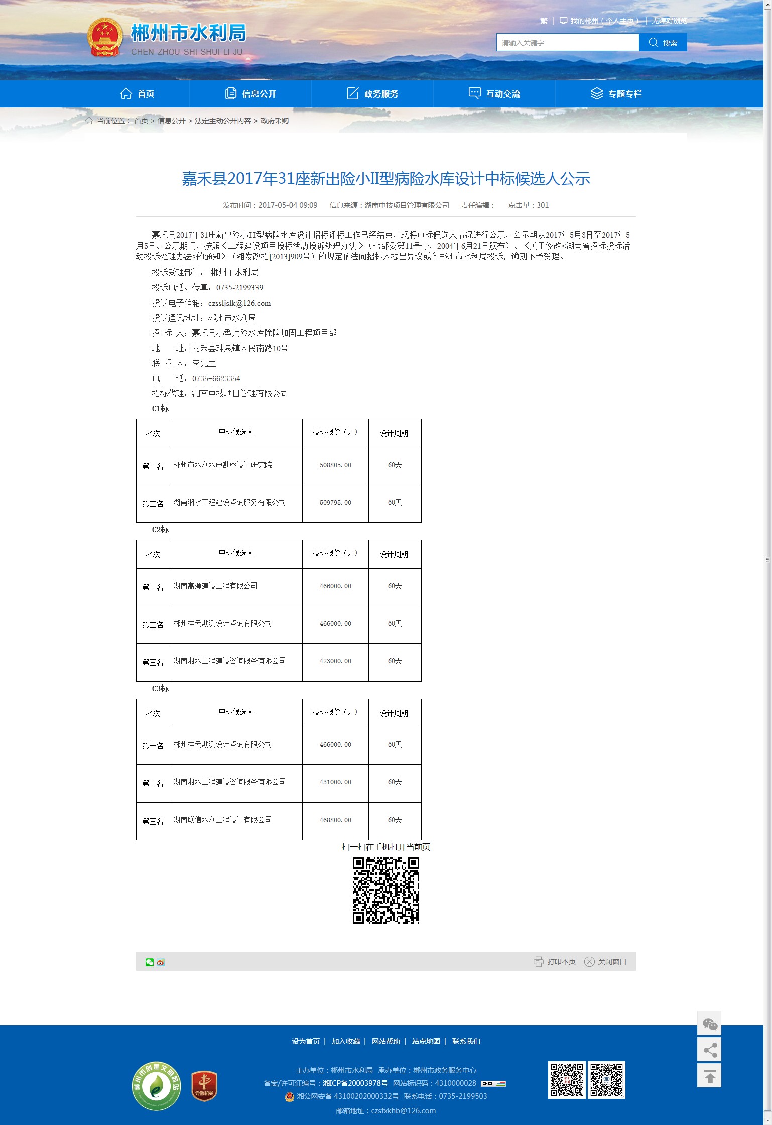 嘉禾县2017年31座新出险小II型病险水库设计招标评标工作已经结束,现将中标候选人情况进行公示,公示期从2017年5月3日至2017年5月5日。公示期间,按照《工程建设项目投标活动投诉处理办法》(七部委第11号令,2004年6月21日颁布)、《关于修改<湖南省招标投标活动投诉处理办法>的通知》(湘发改招[2013]909号)的规定依法向招标人提出异议或向郴州市水利局投诉,逾期不予受理。