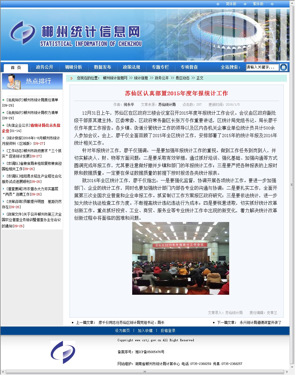 12月31日上午,苏仙区在区政府三楼会议室召开2015年度年报统计工作会议。会议由区政府副处级干部原其建主持,区委常委、区政府常务副区长张万冬作重要讲话,区统计局党组书记、局长廖千仪作年度工作报告。各乡镇、街道分管统计工作的领导以及区内各机关企事业单位统计员共计500余人参加会议。会上,廖千仪全面回顾了2015年全区统计工作,安排部署了2015年的统计年报及2016年统计相关工作。