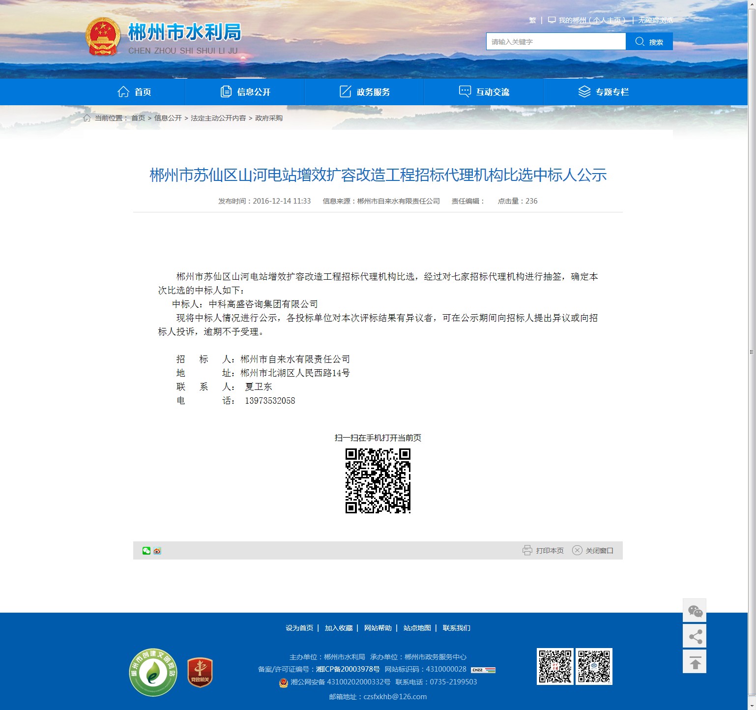 郴州市苏仙区山河电站增效扩容改造工程招标代理机构比选,经过对七家招标代理机构进行抽签,确定本次比选的中标人如下: