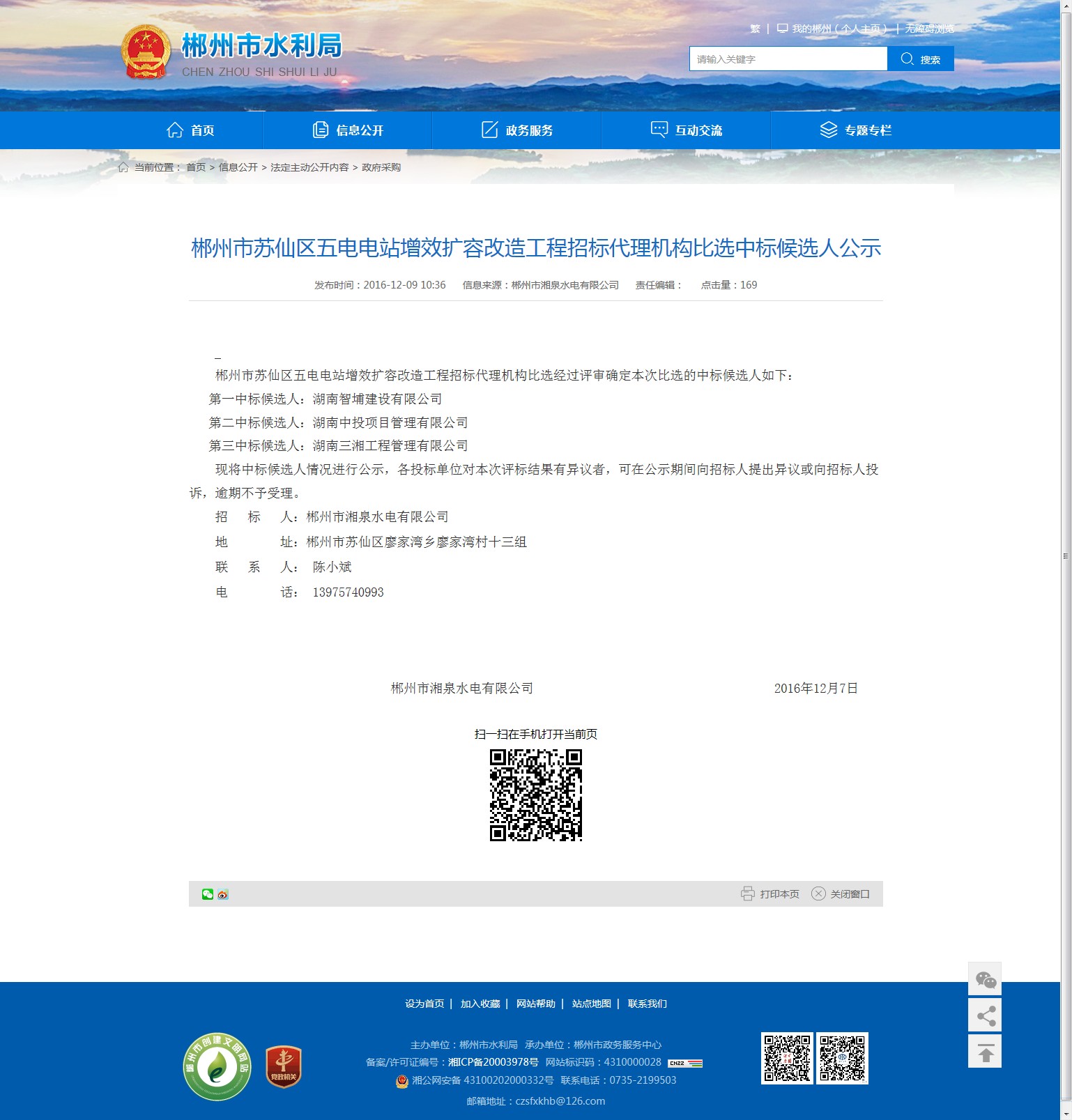 郴州市苏仙区五电电站增效扩容改造工程招标代理机构比选经过评审确定本次比选的中标候选人如下: