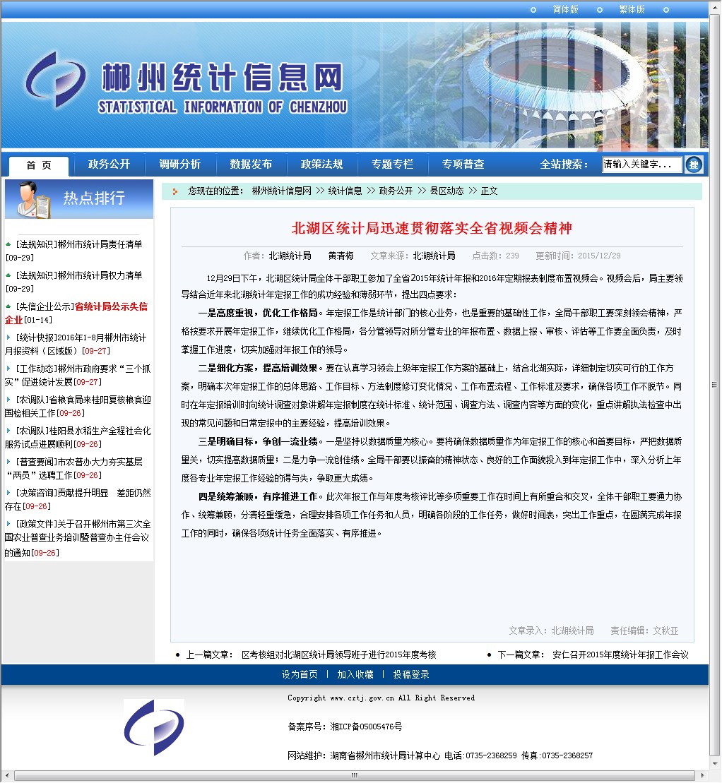 12月29日下午,北湖区统计局全体干部职工参加了全省2015年统计年报和2016年定期报表制度布置视频会。视频会后,局主要领导结合近年来北湖统计年定报工作的成功经验和薄弱环节,提出四点要求: