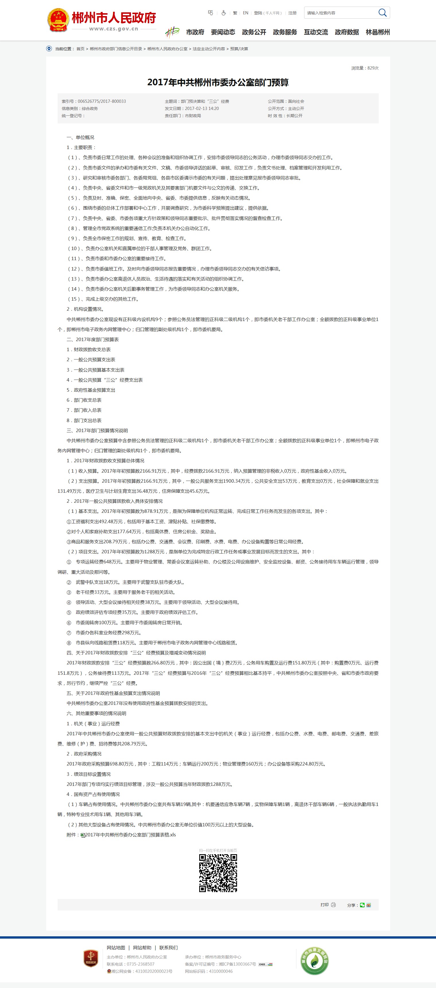 2017年财政拨款安排“三公”经费预算数266.80万元,其中:因公出国(境)费2万元,公务用车购置及运行费151.80万元(其中:购置费0万元、运行费151.8万元),公务接待费113万元。2017年“三公”经费预算与2016年“三公”经费预算相比基本持平,中共郴州市委办公室按照中央、省和市委市政府要求,厉行节约,继续严控“三公”经费。