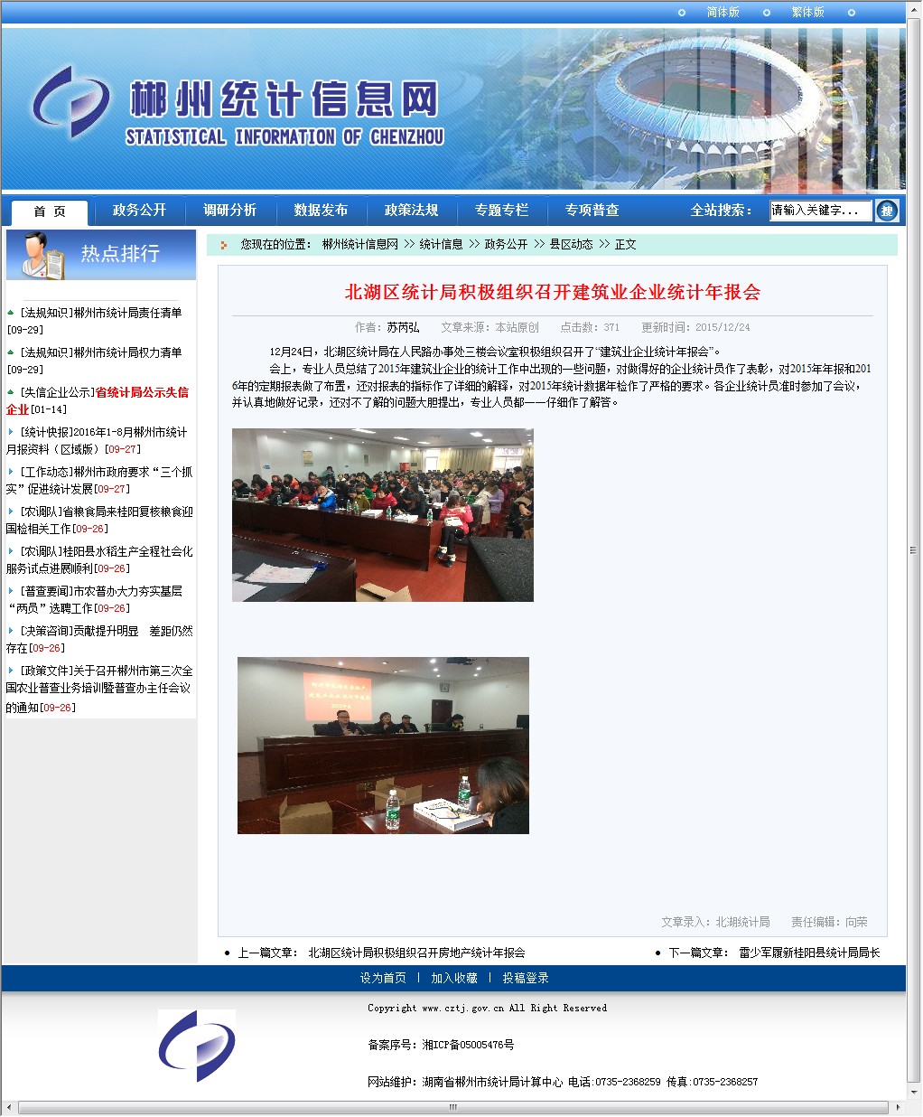 12月24日,北湖区统计局在人民路办事处三楼会议室积极组织召开了“建筑业企业统计年报会”。 会上,专业人员总结了2015年建筑业企业的统计工作中出现的一些问题,对做得好的企业统计员作了表彰,对2015年年报和2016年的定期报表做了布置,还对报表的指标作了详细的解释,对2015年统计数据年检作了严格的要求。各企业统计员准时参加了会议,并认真地做好记录,还对不了解的问题大胆提出,专业人员都一一仔细作了解答。