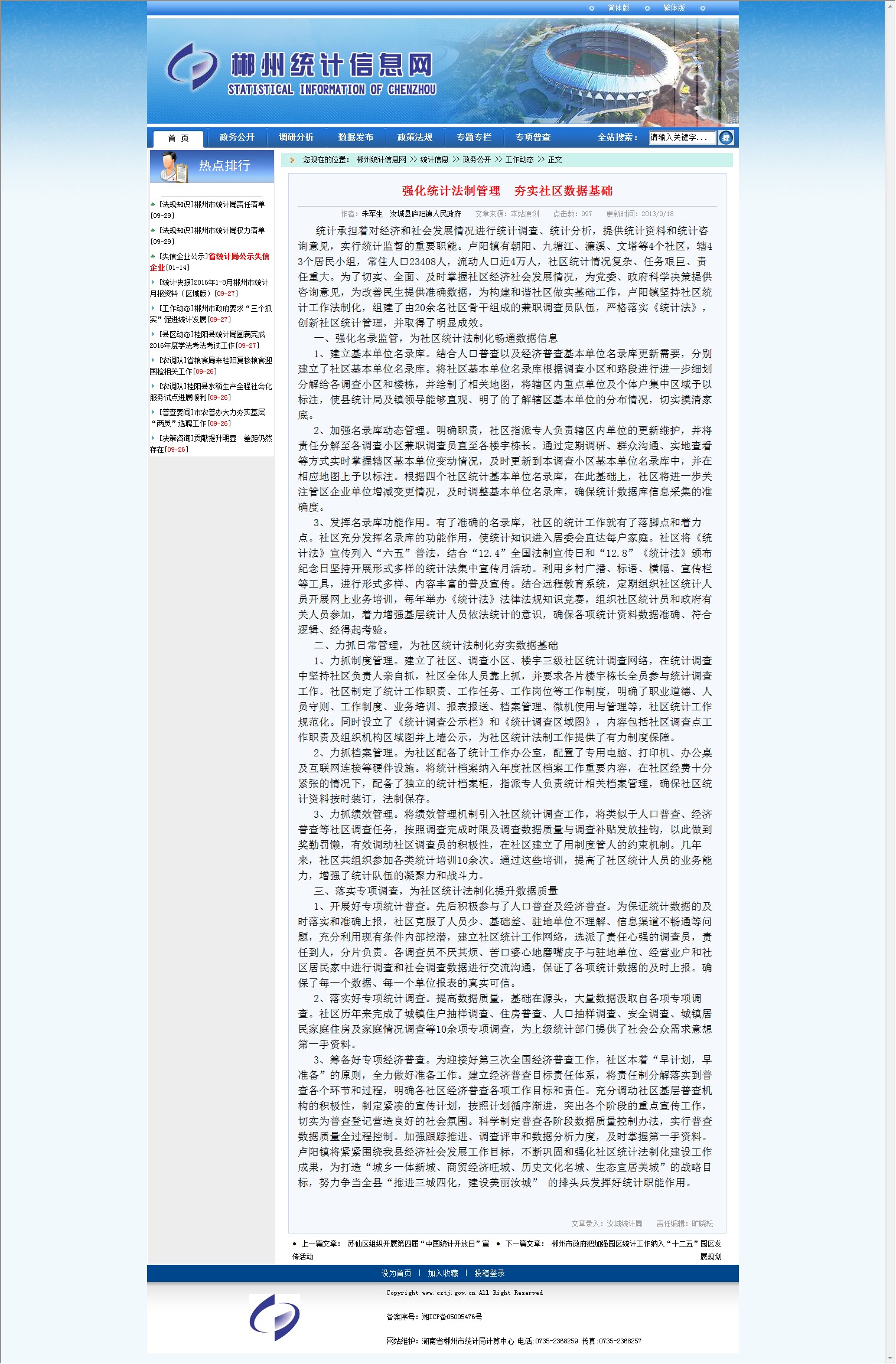 1、力抓制度管理。建立了社区、调查小区、楼宇三级社区统计调查网络,在统计调查中坚持社区负责人亲自抓,社区全体人员靠上抓,并要求各片楼宇栋长全员参与统计调查工作。社区制定了统计工作职责、工作任务、工作岗位等工作制度,明确了职业道德、人员守则、工作制度、业务培训、报表报送、档案管理、微机使用与管理等,社区统计工作规范化。同时设立了《统计调查公示栏》和《统计调查区域图》,内容包括社区调查点工作职责及组织机构区域图并上墙公示,为社区统计法制工作提供了有力制度保障。