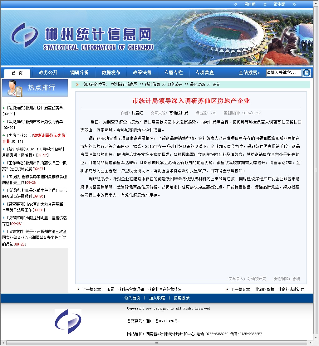 近日,为调查了解全市房地产行业经营状况及未来发展趋势,市统计局综合科、投资科等科室负责人调研苏仙区碧桂园翡翠山、凤凰新城、金科城等房地产企业项目。