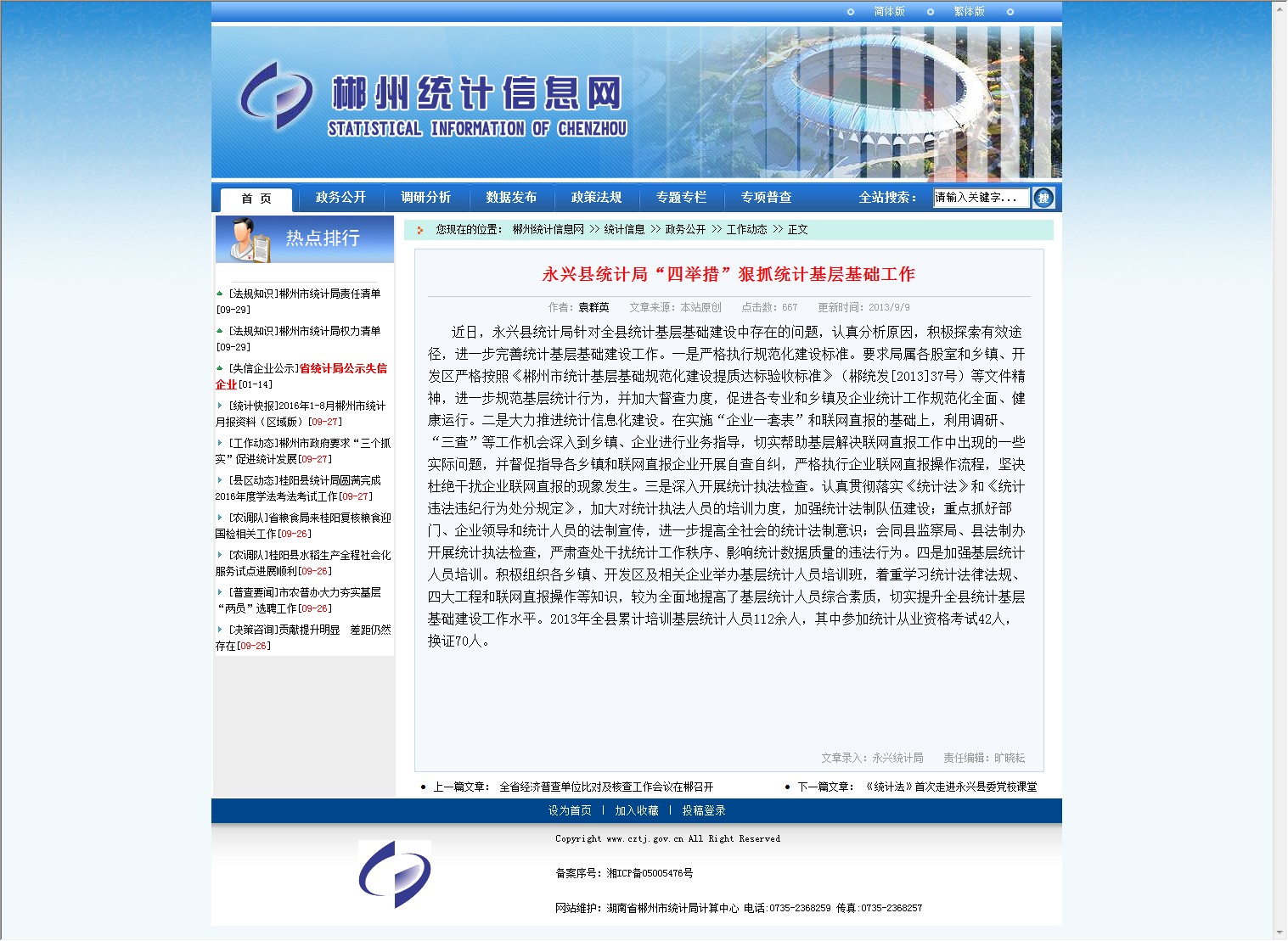 近日,永兴县统计局针对全县统计基层基础建设中存在的问题,认真分析原因,积极探索有效途径,进一步完善统计基层基础建设工作。一是严格执行规范化建设标准。要求局属各股室和乡镇、开发区严格按照《郴州市统计基层基础规范化建设提质达标验收标准》(郴统发[2013]37号)等文件精神,进一步规范基层统计行为,并加大督查力度,促进各专业和乡镇及企业统计工作规范化全面、健康运行。二是大力推进统计信息化建设。在实施“企业一套表”和联网直报的基础上,利用调研、“三查”等工作机会深入到乡镇、企业进行业务指导,切实帮助基层解决联网直报工作中出现的一些实际问题,并督促指导各乡镇和联网直报企业开展自查自纠,严格执行企业联网直报操作流程,坚决杜绝干扰企业联网直报的现象发生。三是深入开展统计执法检查。认真贯彻落实《统计法》和《统计违法违纪行为处分规定》,加大对统计执法人员的培训力度,加强统计法制队伍建设;重点抓好部门、企业领导和统计人员的法制宣传,进一步提高全社会的统计法制意识;会同县监察局、县法制办开展统计执法检查,严肃查处干扰统计工作秩序、影响统计数据质量的违法行为。四是加强基层统计人员培训。积极组织各乡镇、开发区及相关企业举办基层统计人员培训班,着重学习统计法律法规、四大工程和联网直报操作等知识,较为全面地提高了基层统计人员综合素质,切实提升全县统计基层基础建设工作水平。2013年全县累计培训基层统计人员112余人,其中参加统计从业资格考试42人,换证70人。